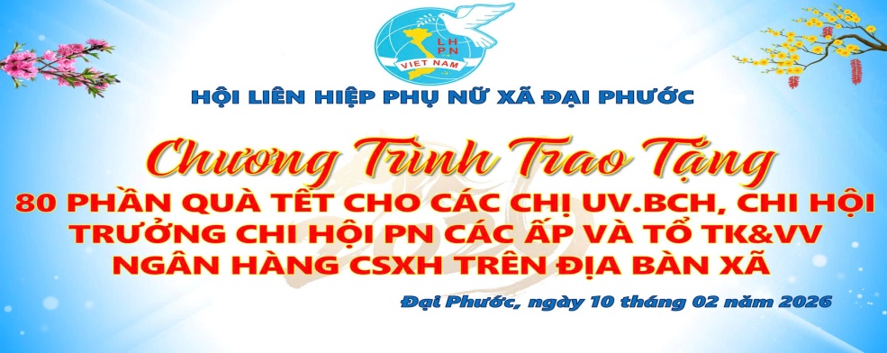 Nhân dịp Tết Nguyên đán 2026, Hội Liên hiệp Phụ nữ (LHPN) xã Đại Phước đã tổ chức chương trình thăm hỏi và trao tặng 80 phần quà Tết đến Ban Chấp hành Hội cùng các Tổ vay vốn & tiết kiệm NHCSXH trên...