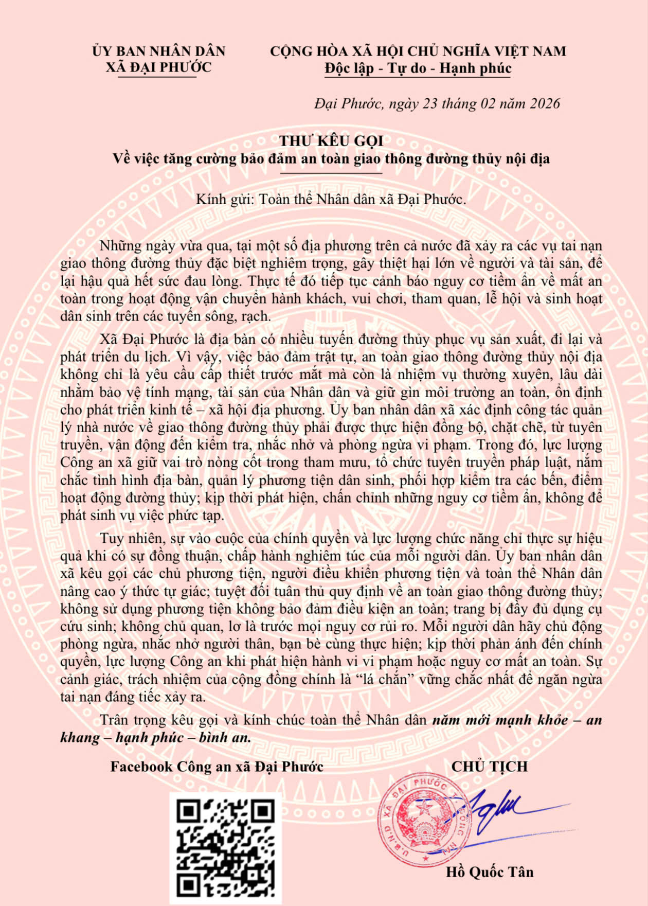 Thư kêu gọi của Chủ tịch UBND xã khẳng định rõ tinh thần chủ động phòng ngừa từ sớm, từ xa của chính quyền địa phương trong bảo đảm an toàn giao thông đường thủy; đồng thời phát huy vai trò, trách nhiệm của mỗi tổ chức, cá nhân trong cộng đồng. Khi mỗi người dân nâng cao ý thức chấp hành pháp luật, đồng lòng cùng chính quyền, đó chính là nền tảng vững chắc để phòng ngừa tai nạn, giữ gìn môi trường giao thông đường thủy an toàn, ổn định và phát triển bền vững.