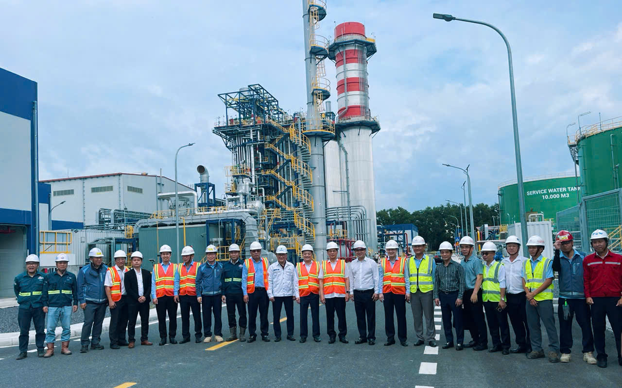 Đồng chí Phó Thủ tướng Bùi Thanh Sơn (thứ 3 từ trái qua) tặng quà cho cán bộ nhân viên nhà máy điện Nhơn Trạch 3 và Nhơn Trạch 4