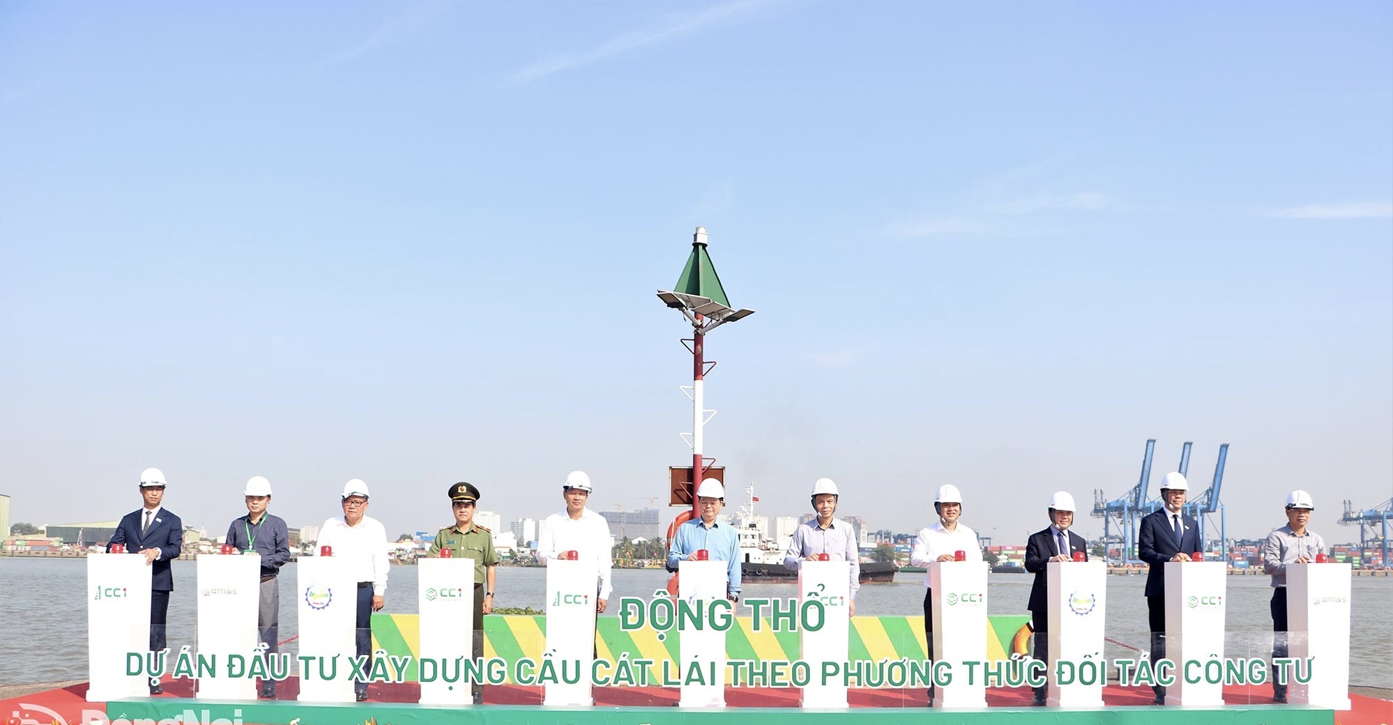 Ủy viên Trung ương Đảng, Phó Thủ tướng Chính phủ Mai Văn Chính (giữa); Bí thư Tỉnh ủy, Trưởng đoàn Đại biểu Quốc hội tỉnh Đồng Nai Vũ Hồng Văn (thứ 5, từ trái qua) và các đại biểu thực hiện nghi thức bấm nút động thổ Dự án Đầu tư xây dựng cầu Cát Lái