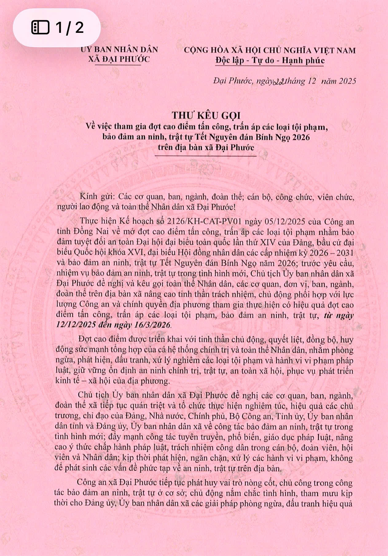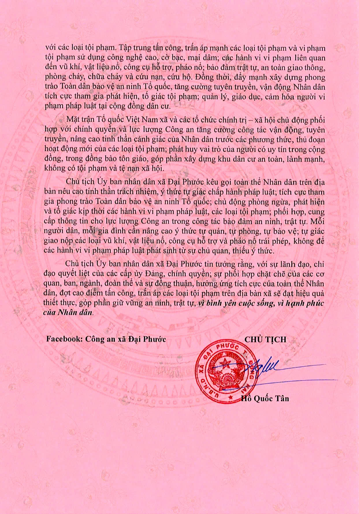 Theo nội dung Thư kêu gọi, trước yêu cầu, nhiệm vụ bảo đảm an ninh, trật tự trong tình hình mới, Chủ tịch Ủy ban nhân dân xã Đại Phước đề nghị các cơ quan, đơn vị, tổ chức chính trị – xã hội và Nhân dân nâng cao tinh thần trách nhiệm, phát huy sức mạnh tổng hợp của cả hệ thống chính trị và khối đại đoàn kết toàn dân, chủ động phối hợp với lực lượng Công an và chính quyền địa phương trong công tác phòng ngừa, phát hiện, đấu tranh với các loại tội phạm và hành vi vi phạm pháp luật, góp phần giữ vững ổn định an ninh chính trị, trật tự, an toàn xã hội trên địa bàn xã trong thời gian từ ngày 12/12/2025 đến ngày 16/3/2026.