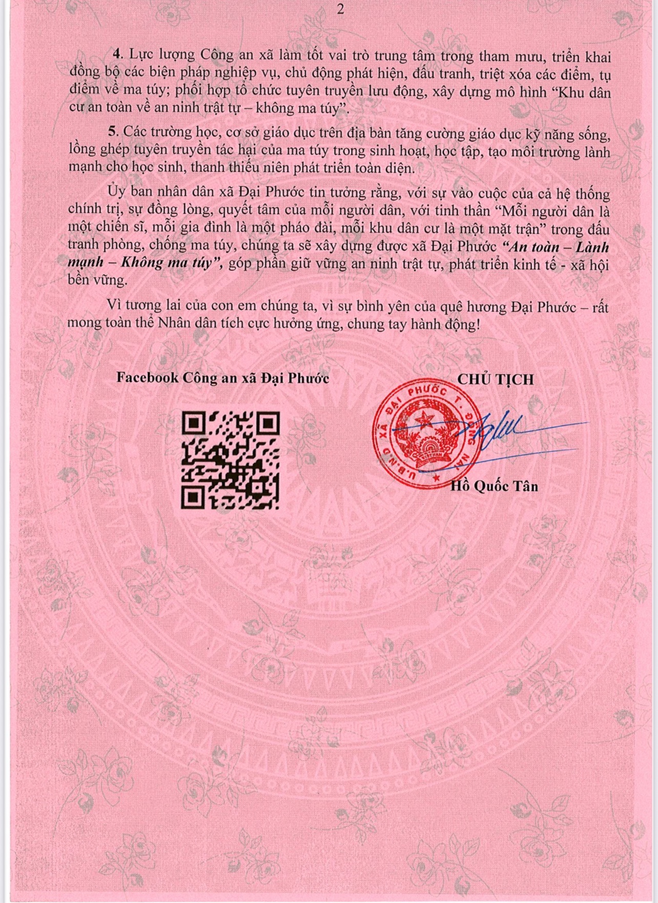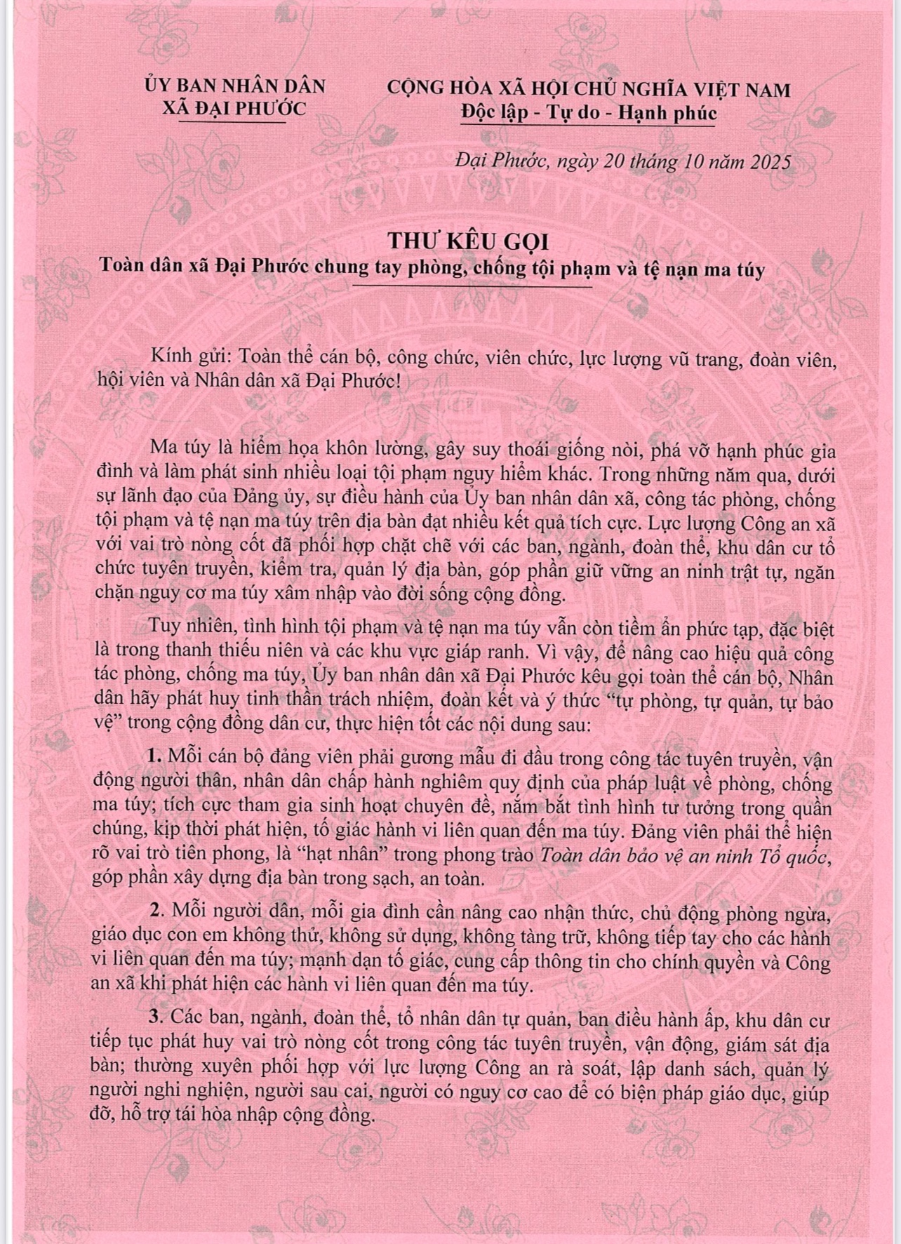 Thư kêu gọi khẳng định quyết tâm của Đảng ủy, UBND và Nhân dân xã Đại Phước trong công tác phòng, chống ma túy với phương châm: “Mỗi người dân là một chiến sĩ – Mỗi gia đình là một pháo đài – Mỗi khu dân cư là một mặt trận trong đấu tranh phòng, chống ma túy.”