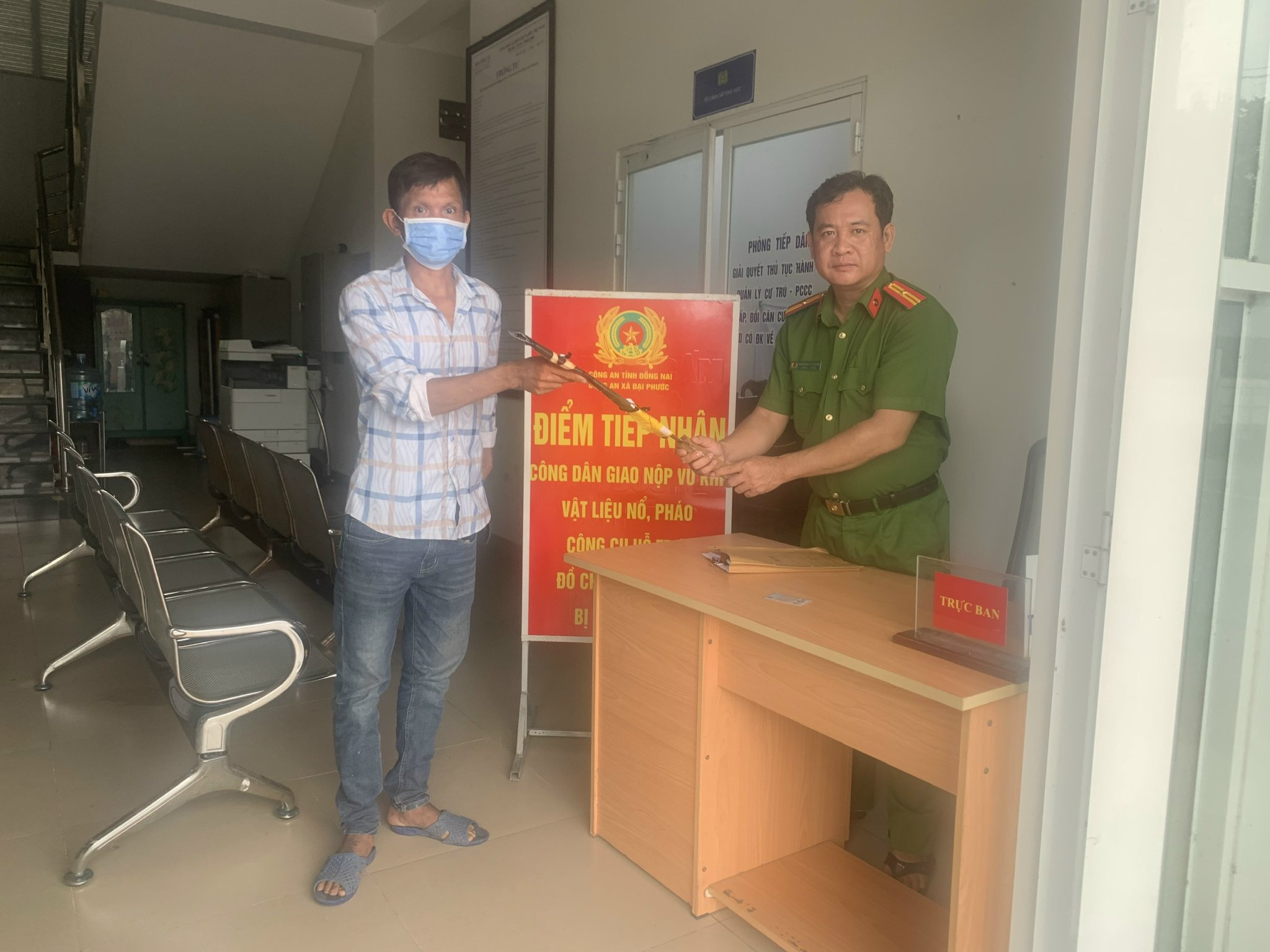 Hình ảnh Công an xã Đại Phước tiếp nhận mã tấu do người dân tự nguyện giao nộp