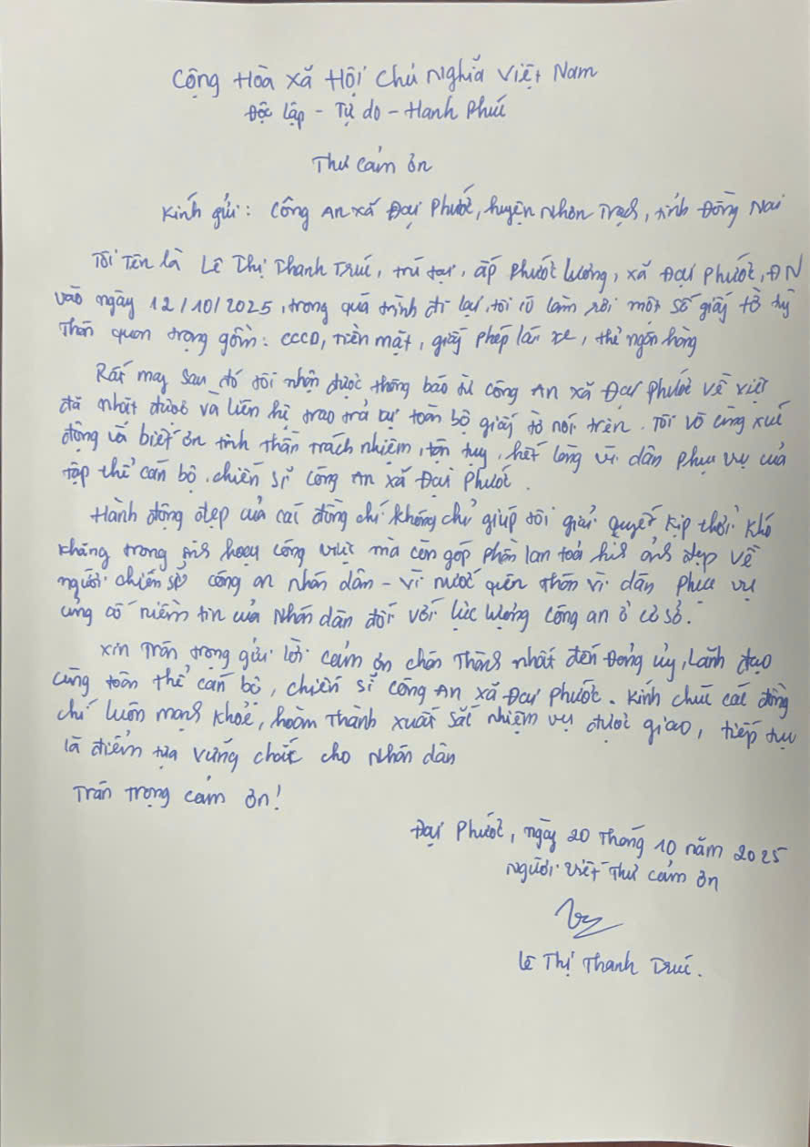Thư cảm ơn của chị Lê Thị Thanh Trúc gửi Công an xã Đại Phước