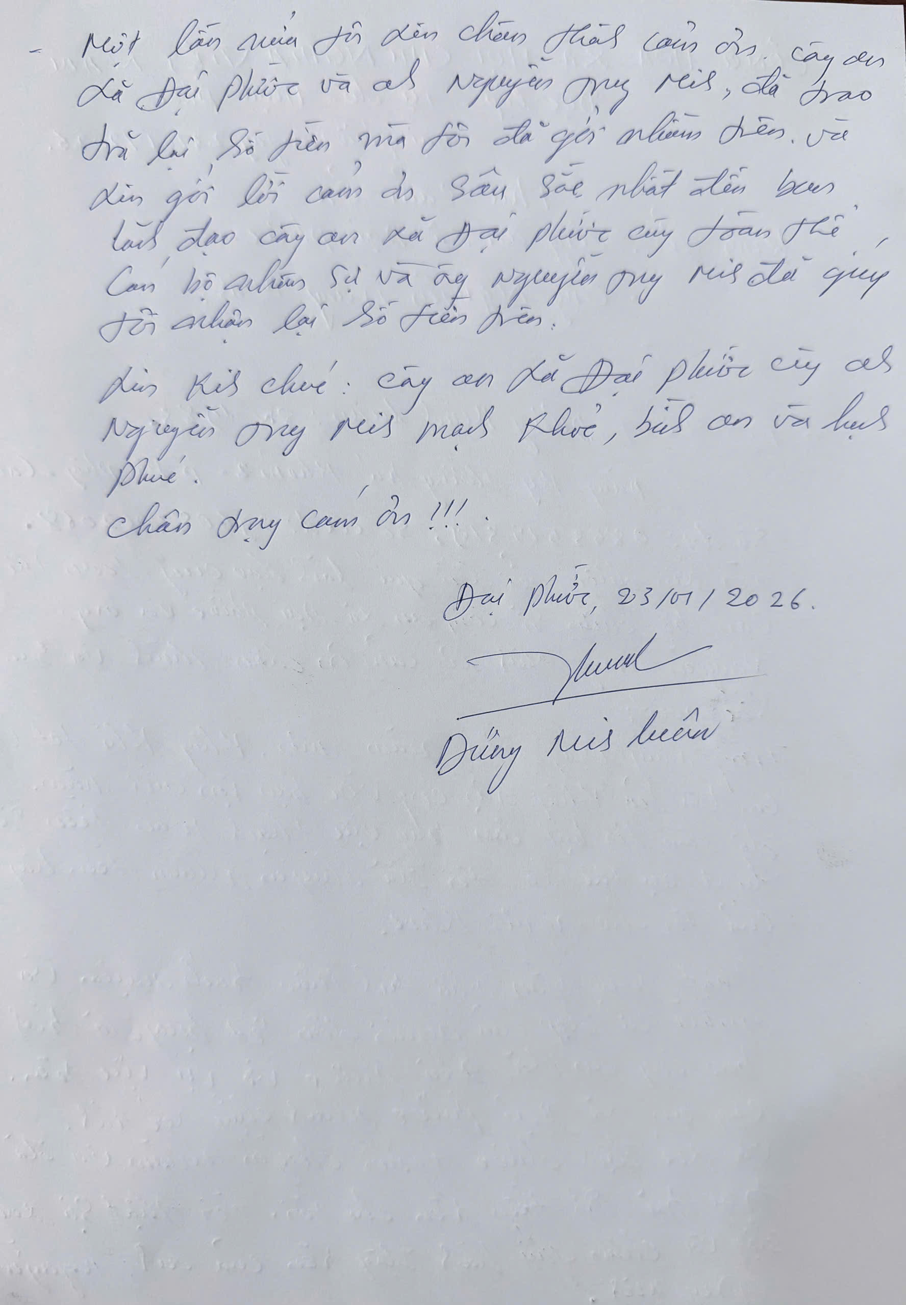 Ông Dương Minh Luân viết Thư cảm ơn Công an xã Đại Phước và ông Nguyễn Trung Minh