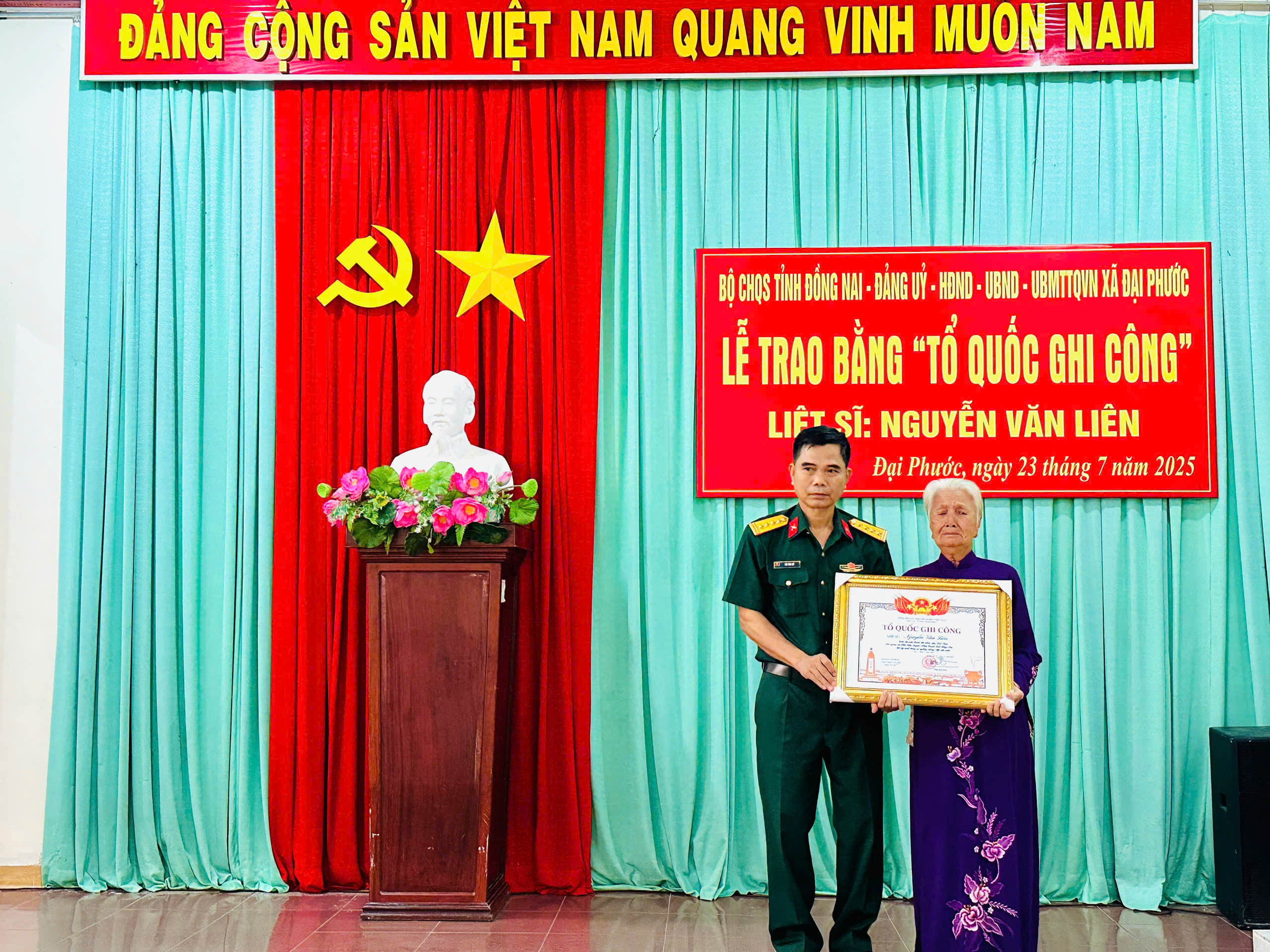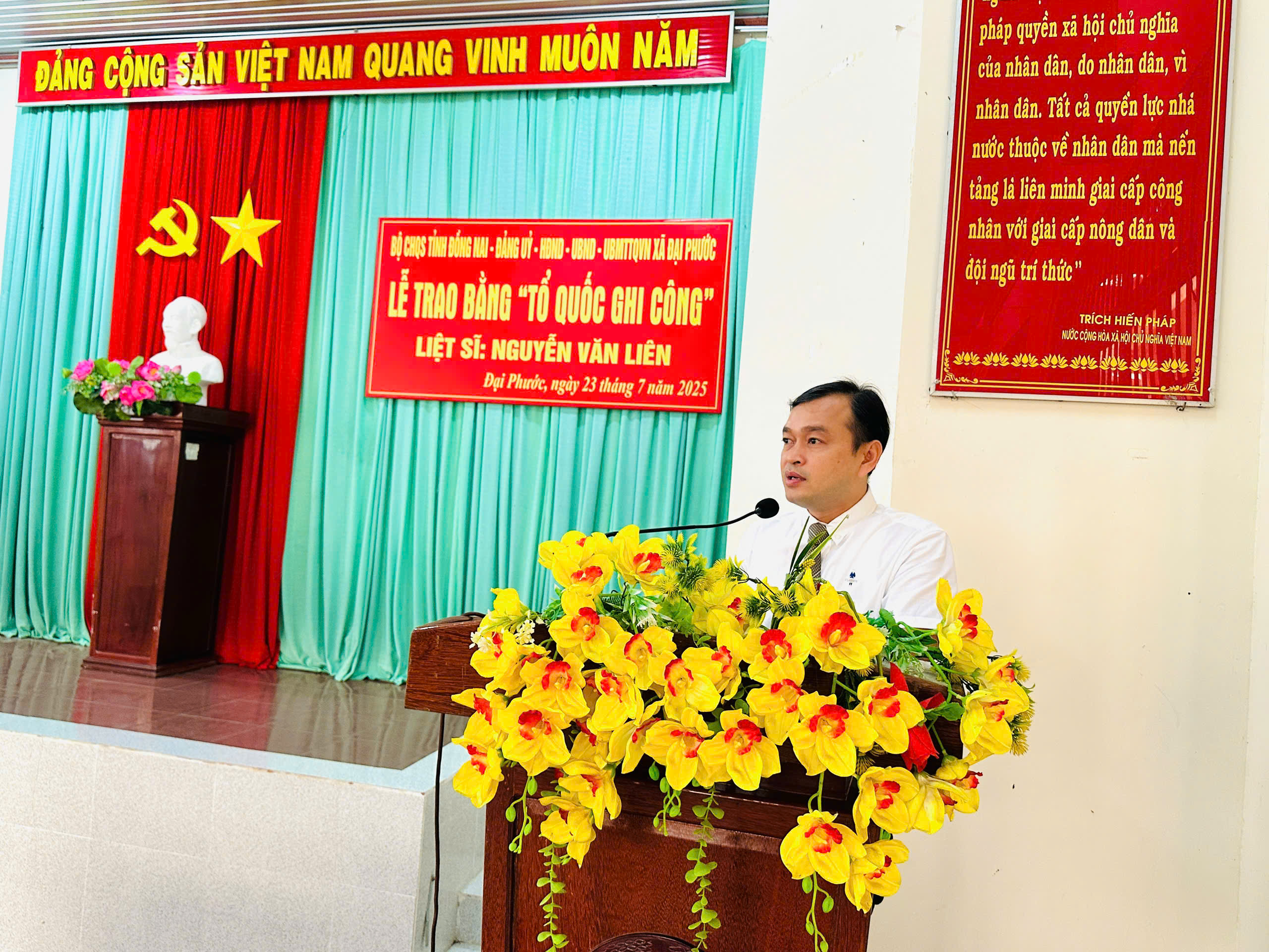 Tại buổi lễ, Đồng chí Phan Chí Thảo – Phó Chủ tịch UBND xã Đại Phước đã bày tỏ lòng tri ân sâu sắc và khẳng định việc trao Bằng “Tổ quốc ghi công” là sự ghi nhận công lao trong quá trình công tác, cống hiến, hy sinh của các liệt sĩ và gia đình trong các cuộc kháng chiến vì độc lập, tự do cho Tổ quốc. Đây cũng là dịp để Bộ CHQS tỉnh và chính quyền địa phương các xã Đại Phước tiếp tục phát huy truyền thống đoàn kết, đẩy mạnh công tác “Đền ơn đáp nghĩa”, chăm lo đời sống cho các gia đình chính sách, thương binh, bệnh binh, người có công nhân kỷ niệm 78 năm ngày Thương binh – Liệt sỹ (27/7/1947-27/7/2025).