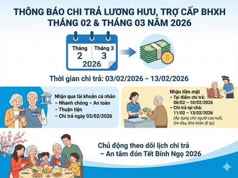 Thông báo về việc chi trả lương hưu, trợ cấp BHXH tháng 02 và tháng 03 năm 2026