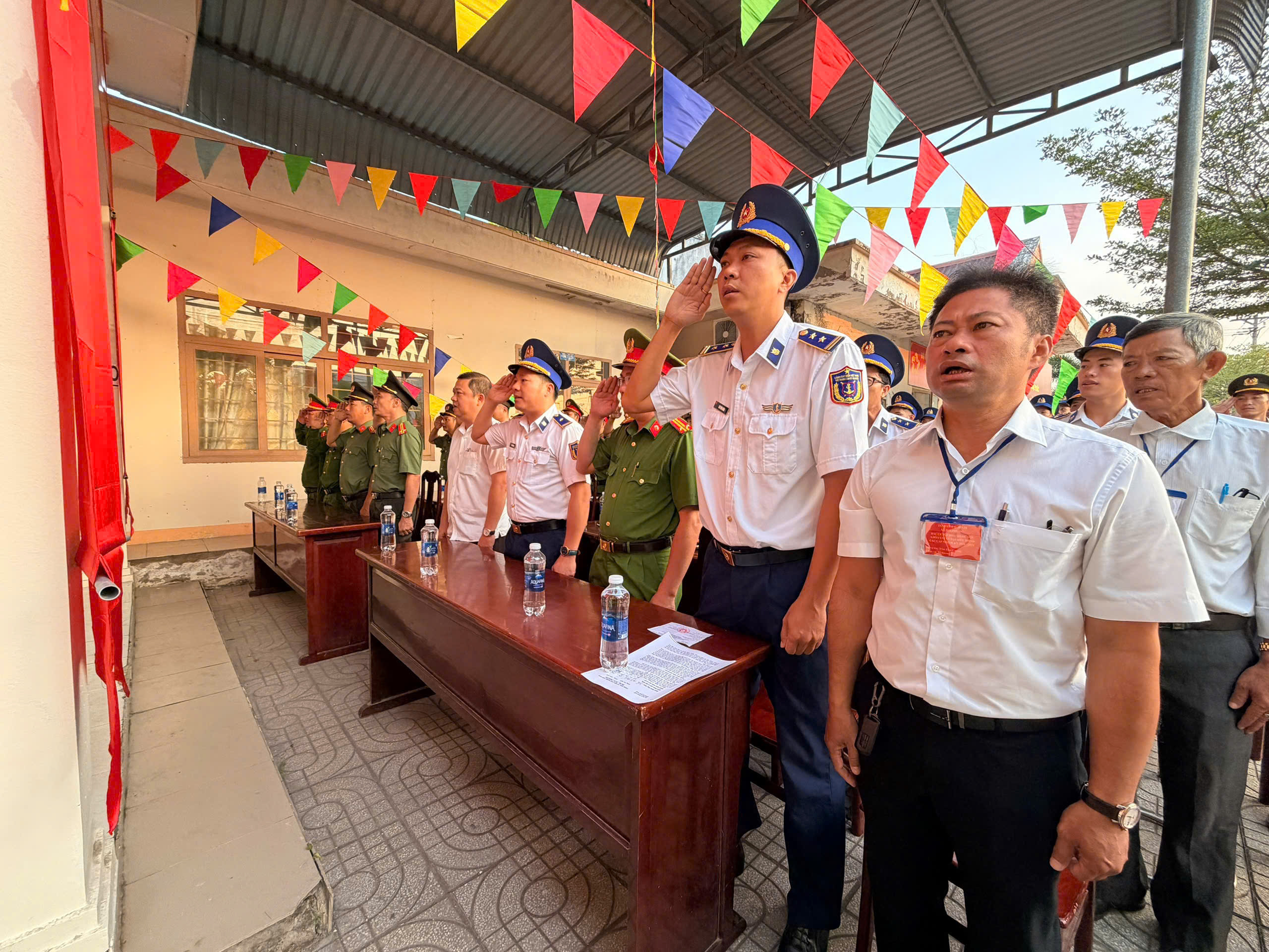 Hình ảnh lực lượng Công an xã dự khai mạc tại khu vực bỏ phiếu số 28, ấp Cát Lái (trong khuôn viên trụ sở Công an xã)