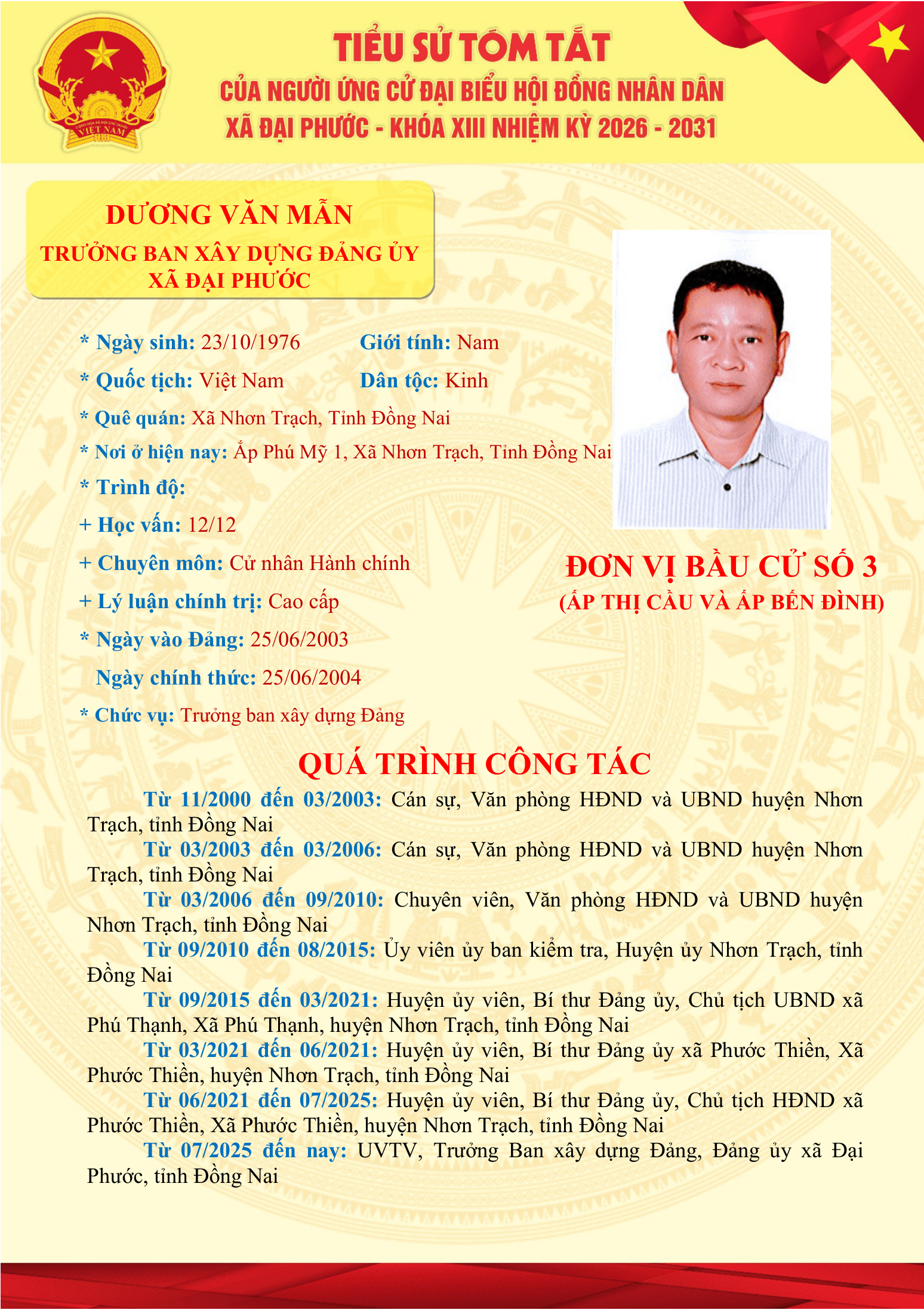 Danh sách những người ứng cử Đại biểu HĐND xã Đại Phước khóa XIII, nhiệm kỳ 2026-2031 tại đơn vị bầu cử số 03 (ấp Thị Cầu và ấp Bến Đình)