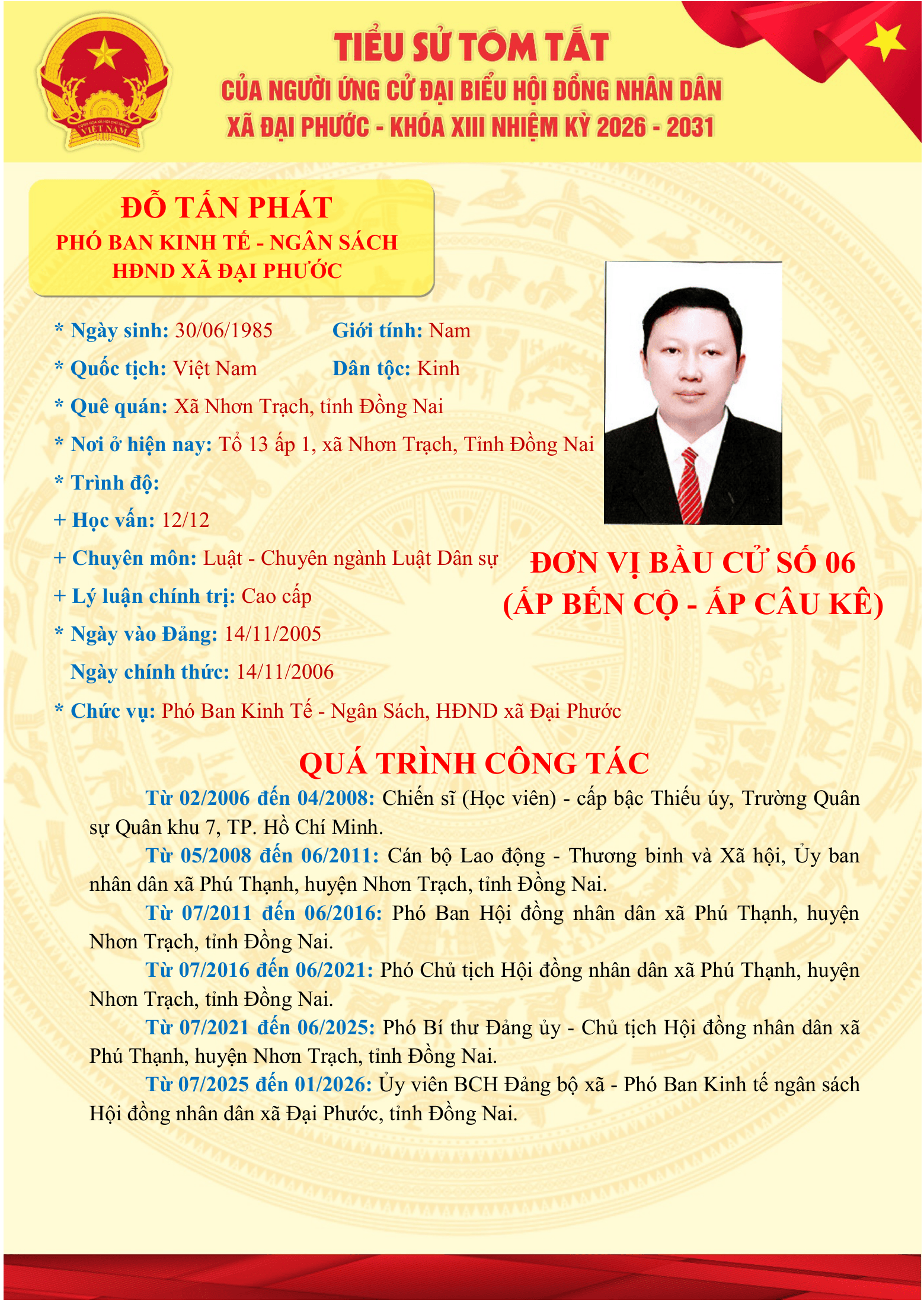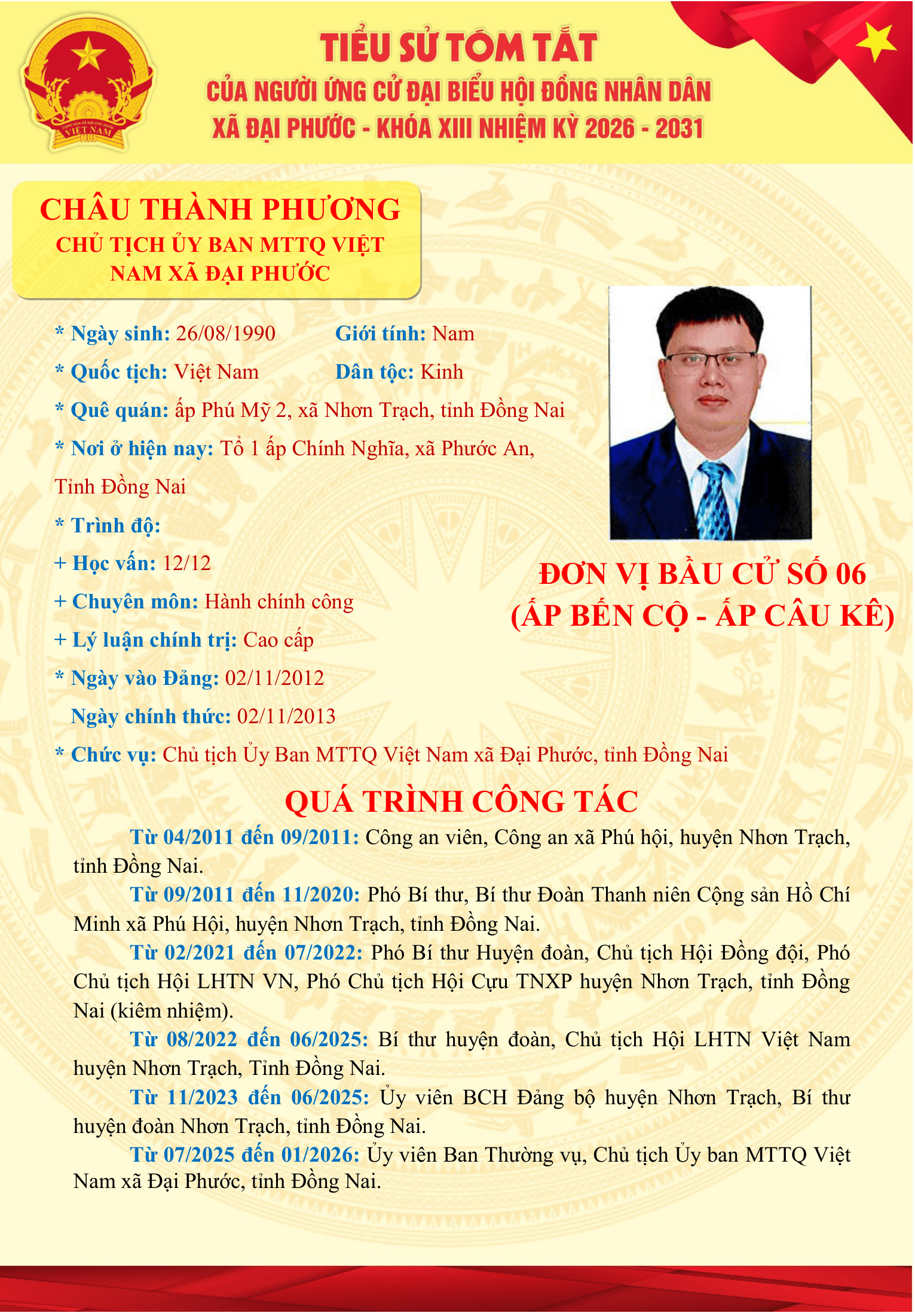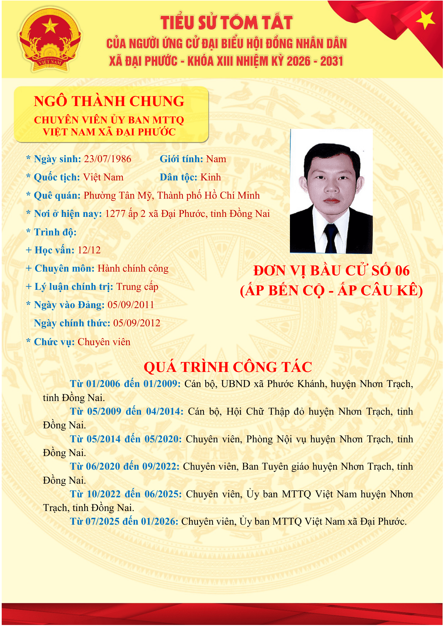 Danh sách những người ứng cử Đại biểu HĐND xã Đại Phước khóa XIII, nhiệm kỳ 2026-2031 tại đơn vị bầu cử số 06 (ấp Bến Cộ và ấp Câu Kê)