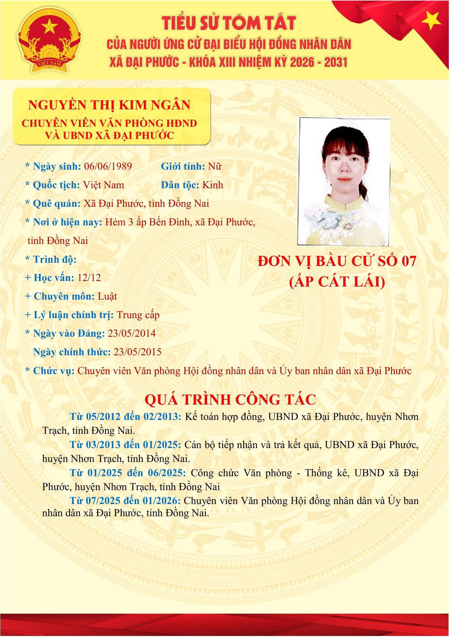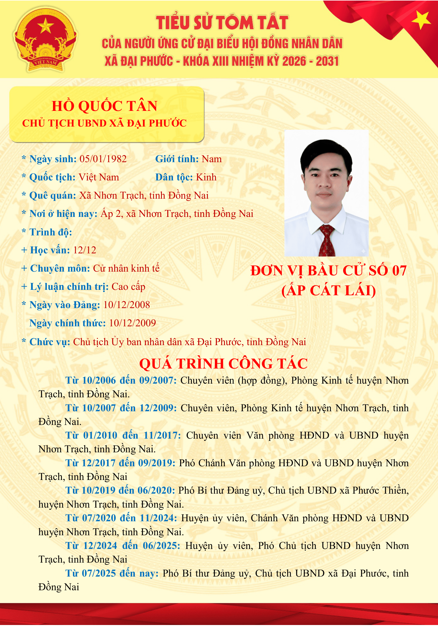 Danh sách những người ứng cử Đại biểu HĐND xã Đại Phước khóa XIII, nhiệm kỳ 2026-2031 tại đơn vị bầu cử số 07 (ấp Cát Lái)