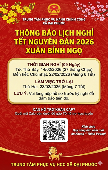 Trung tâm Phục vụ Hành chính công xã Đại Phước thông báo: LỊCH NGHỈ TẾT NGUYÊN ĐÁN BÍNH NGỌ NĂM 2026
