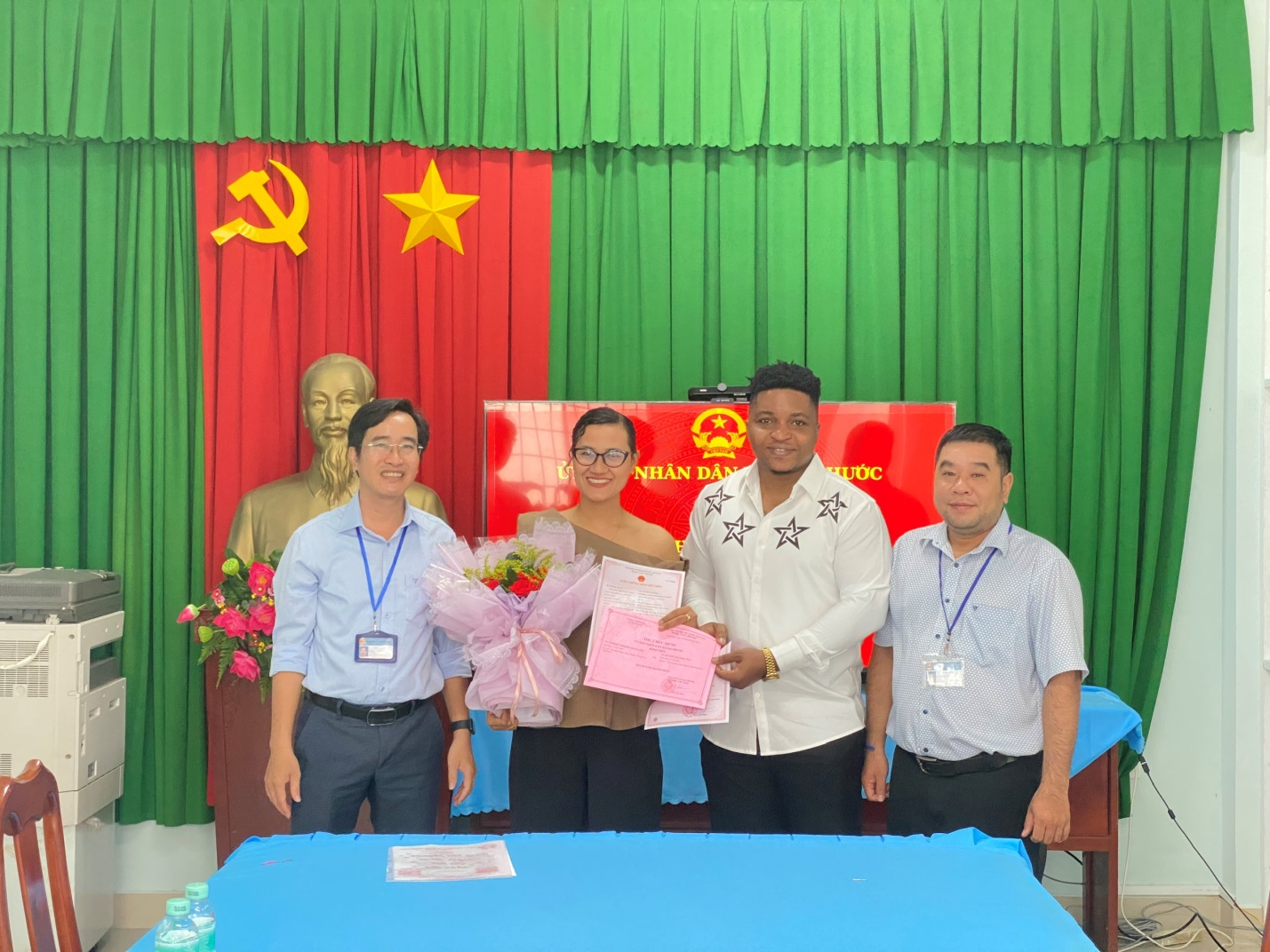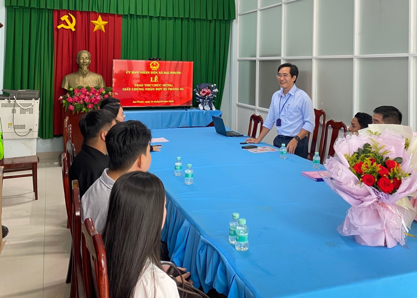 Buổi lễ diễn ra trong không khí ấm áp, tràn đầy niềm vui và tiếng cười. Những lẵng hoa tươi thắm cùng những tấm Thư chúc mừng được chuẩn bị chu đáo đã sẵn sàng để gửi gắm tình cảm của chính quyền địa phương đến với bà con. Đây không chỉ là một quy trình trả kết quả hồ sơ hành chính thông thường, mà đã trở thành một nét văn hóa đẹp, thể hiện sự trân trọng của Đảng bộ, chính quyền xã Đại Phước đối với những sự kiện trọng đại trong cuộc đời của mỗi công dân như: kết hôn hay chào đón thành viên mới trong gia đình. Đại điện cho UBND xã, ông Phạm Sơn Điền – Giám đốc Trung tâm phục vụ Hành chính công xã Đại Phước đã trực tiếp trao Giấy chứng nhận, Thư chúc mừng, tặng hoa và gửi lời chúc mừng hạnh phúc đến các cặp đôi, chúc các cháu thiếu nhi mới chào đời luôn khỏe mạnh, mau lớn.