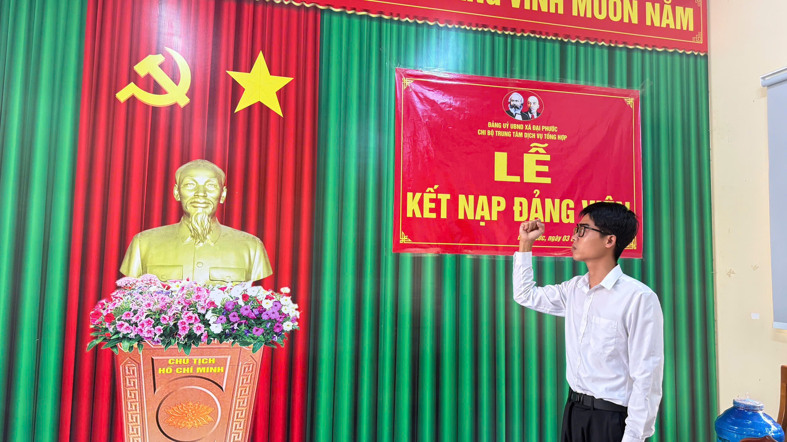 Trong cuộc họp thường kỳ này, Chi bộ đã tổ chức lễ kết nạp đảng viên mới cho quần chúng ưu tú Nguyễn Thành Nguyên là viên chức thuộc Trung tâm Dịch vụ Tổng hợp xã. Buổi lễ diễn ra đúng trình tự, trang nghiêm theo Điều lệ Đảng. Trước Đảng kỳ và chân dung Chủ tịch Hồ Chí Minh, đồng chí Nguyễn Thành Nguyên đã đọc lời tuyên thệ, nguyện tuyệt đối trung thành với mục tiêu lý tưởng của Đảng, nghiêm túc rèn luyện, hoàn thành tốt nhiệm vụ được giao và đóng góp tích cực vào sự phát triển của cơ quan, tập thể.