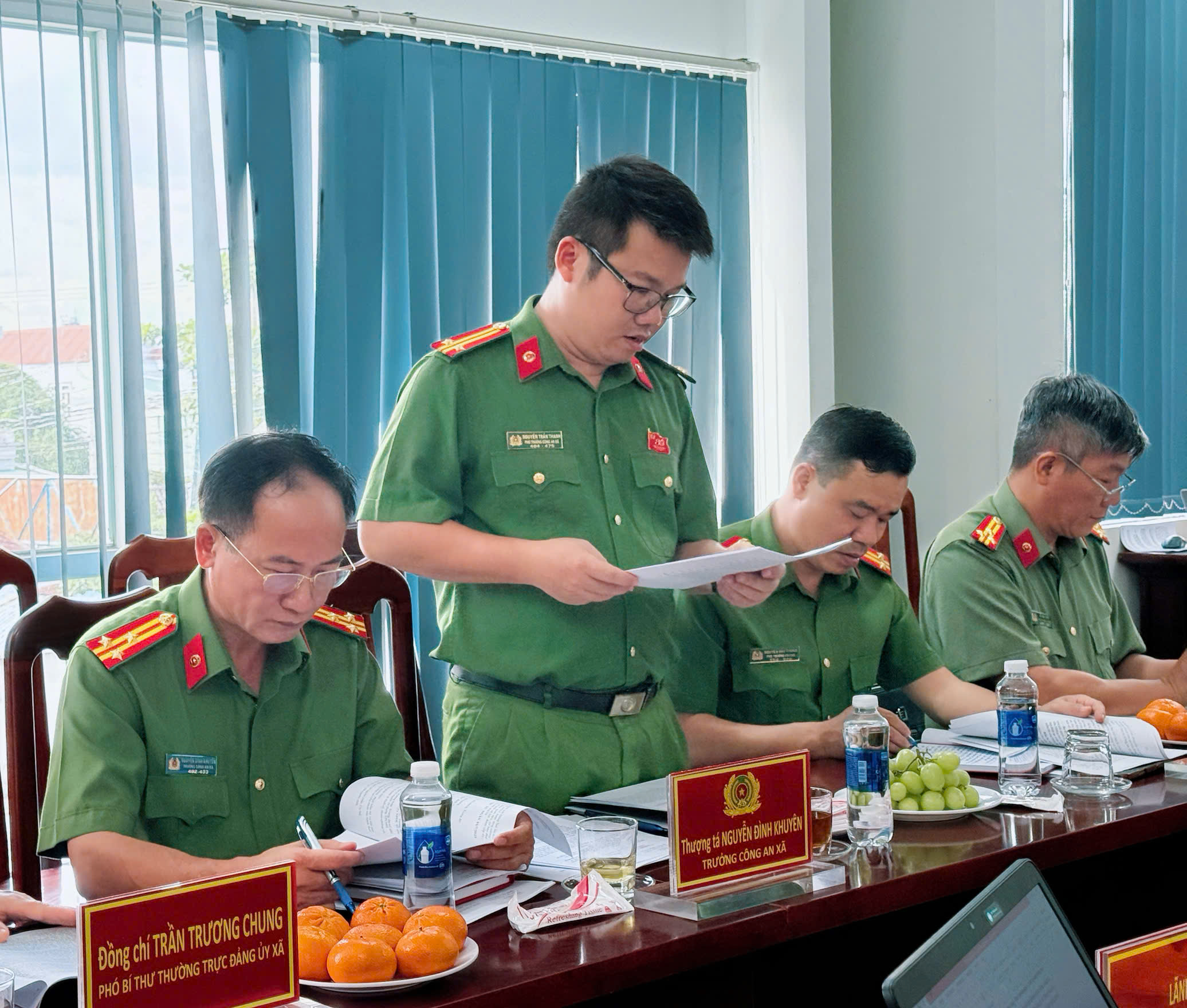 Đồng chí Trung tá Nguyễn Trần Thanh – Phó Bí thư Đảng ủy, Phó Trưởng Công an xã báo cáo kết quả triển khai thực hiện Nghị quyết số 09-NQ/TU