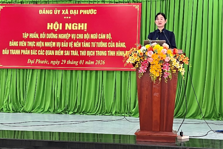 Phát biểu chỉ đạo tại Hội nghị, Ban Thường vụ Đảng ủy xã Đại Phước khẳng định công tác bảo vệ nền tảng tư tưởng của Đảng, đấu tranh phản bác các quan điểm sai trái, thù địch trong tình hình mới là nhiệm vụ chính trị đặc biệt quan trọng, gắn trực tiếp với công tác xây dựng Đảng và bảo vệ chế độ. Ban Thường vụ yêu cầu cấp ủy các chi, đảng bộ trực thuộc và mỗi cán bộ, đảng viên nghiêm túc tiếp thu các nội dung được tập huấn, nâng cao bản lĩnh chính trị, ý thức trách nhiệm, chủ động vận dụng linh hoạt kiến thức, kỹ năng vào thực tiễn công tác tuyên truyền, nhất là trên không gian mạng. Sau Hội nghị, các đơn vị cần sớm cụ thể hóa nội dung tập huấn thành kế hoạch, nhiệm vụ thiết thực, phát huy vai trò nòng cốt của Ban Công tác 35 và đội ngũ cộng tác viên, góp phần giữ vững trận địa tư tưởng của Đảng, tạo sự thống nhất trong Đảng bộ và sự đồng thuận trong Nhân dân. truyền ở cơ sở.