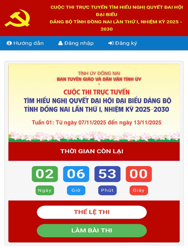 Các bước tham gia cuộc thi: Bước 1: Truy cập trang Cuộc thi tại địa chỉ: https://cuocthi.dangbodongnai.vn hoặc thông qua các đường dẫn được đăng tải trên https://baodongnai.com.vn/, https://dongnai.dcs.vn, Fanpage Tuyên giáo và Dân vận Đồng Nai, Tự hào Đồng Nai, các Trang thông tin điện tử của các sở, ban, ngành, MTTQ và các tổ chức chính trị -xã hội tỉnh, cùng các Đảng ủy trực thuộc Tỉnh ủy. Bước 2: Đăng ký thông tin cá nhân, bao gồm: họ và tên, số điện thoại, đơn vị hoặc địa phương đang sinh sống, làm việc và đơn vị công tác. Bước 3: Sau khi hoàn tất việc đăng ký, thí sinh tiến hành làm bài thi trắc nghiệm trực tuyến, gồm 15 câu hỏi và dự đoán số lượt người tham gia Cuộc thi.