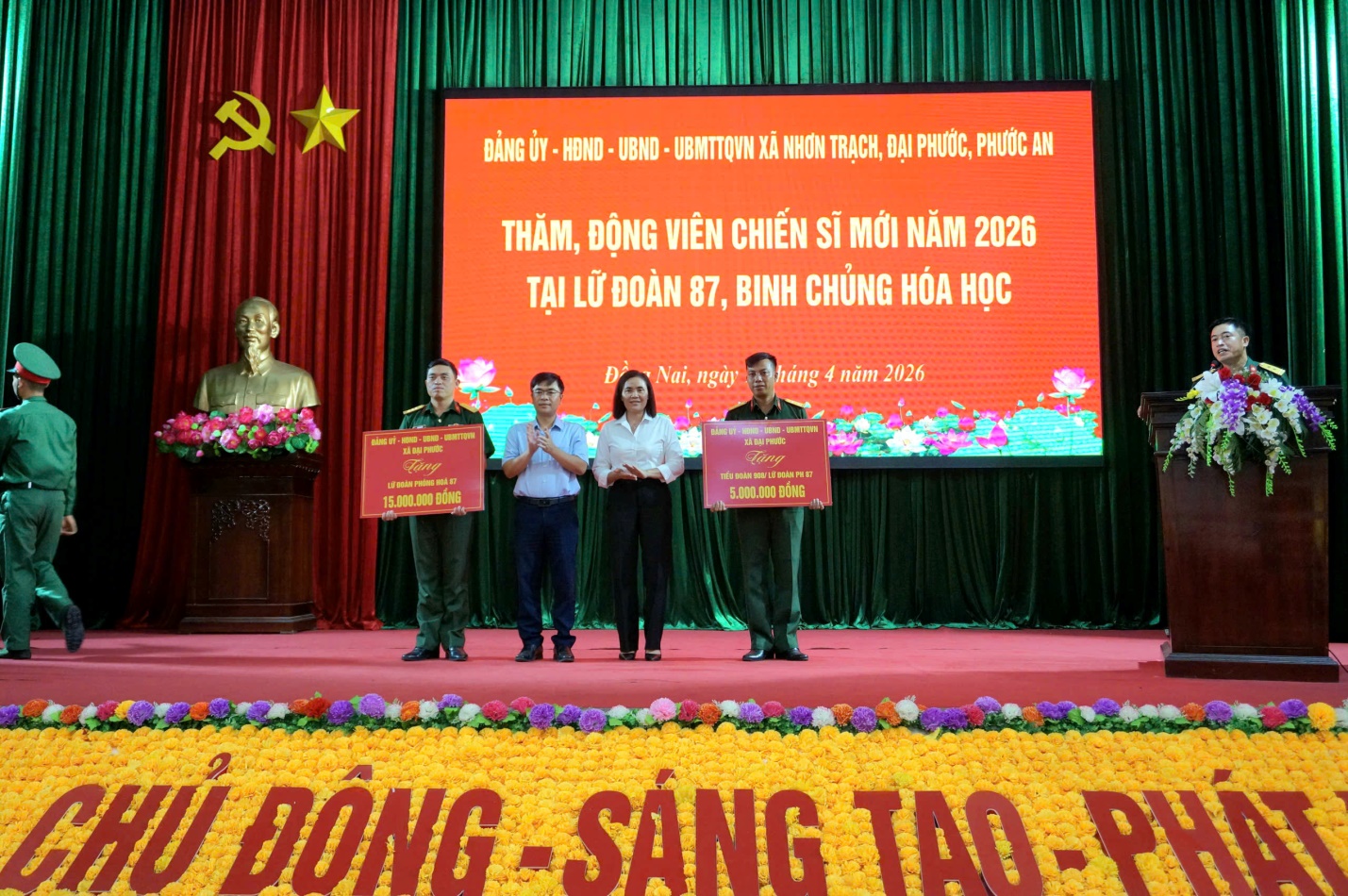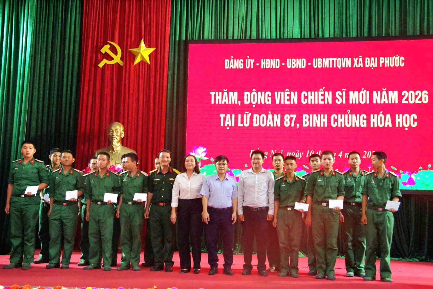 Nhân dịp này, mỗi địa phương đã trao tặng Lữ đoàn 87 – Binh chủng Hóa học số tiền 15 triệu đồng và Tiểu đoàn 908 (đơn vị trực thuộc Lữ đoàn, trực tiếp tiếp nhận và huấn luyện chiến sỹ mới) số tiền 5 triệu đồng nhằm hỗ trợ, động viên tinh thần cán bộ, chiến sỹ. Được biết, trong đợt tuyển quân năm 2026, Lữ đoàn 87 đã tiếp nhận 120 chiến sỹ mới của 03 xã, trong đó xã Đại Phước có 15 chiến sỹ. Lãnh đạo xã cũng đã trao tặng mỗi chiến sỹ một phần quà trị giá 500.000 đồng, thể hiện sự quan tâm, động viên kịp thời từ quê nhà.