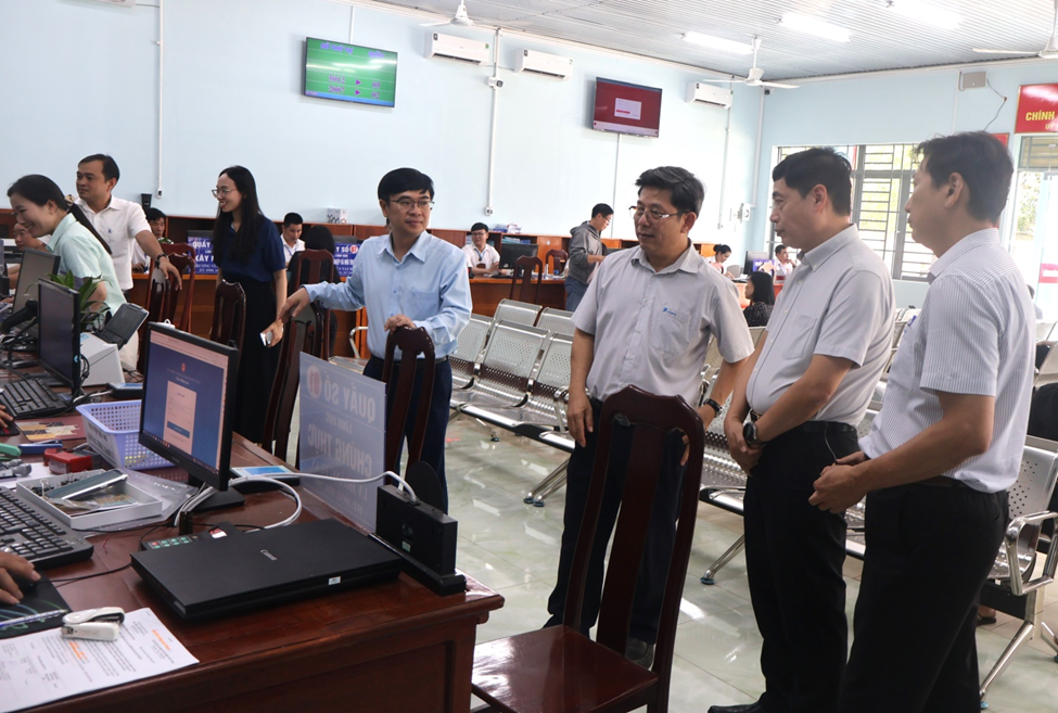 Ông Nguyễn Thành Phúc – Cục trưởng Cục Chuyển đổi số quốc gia, Bộ Khoa học và Công nghệ (thứ 2 từ phải sang) và các thành viên trong Đoàn khảo sát thực tế tại Trung tâm Phục vụ hành chính công xã Đại Phước