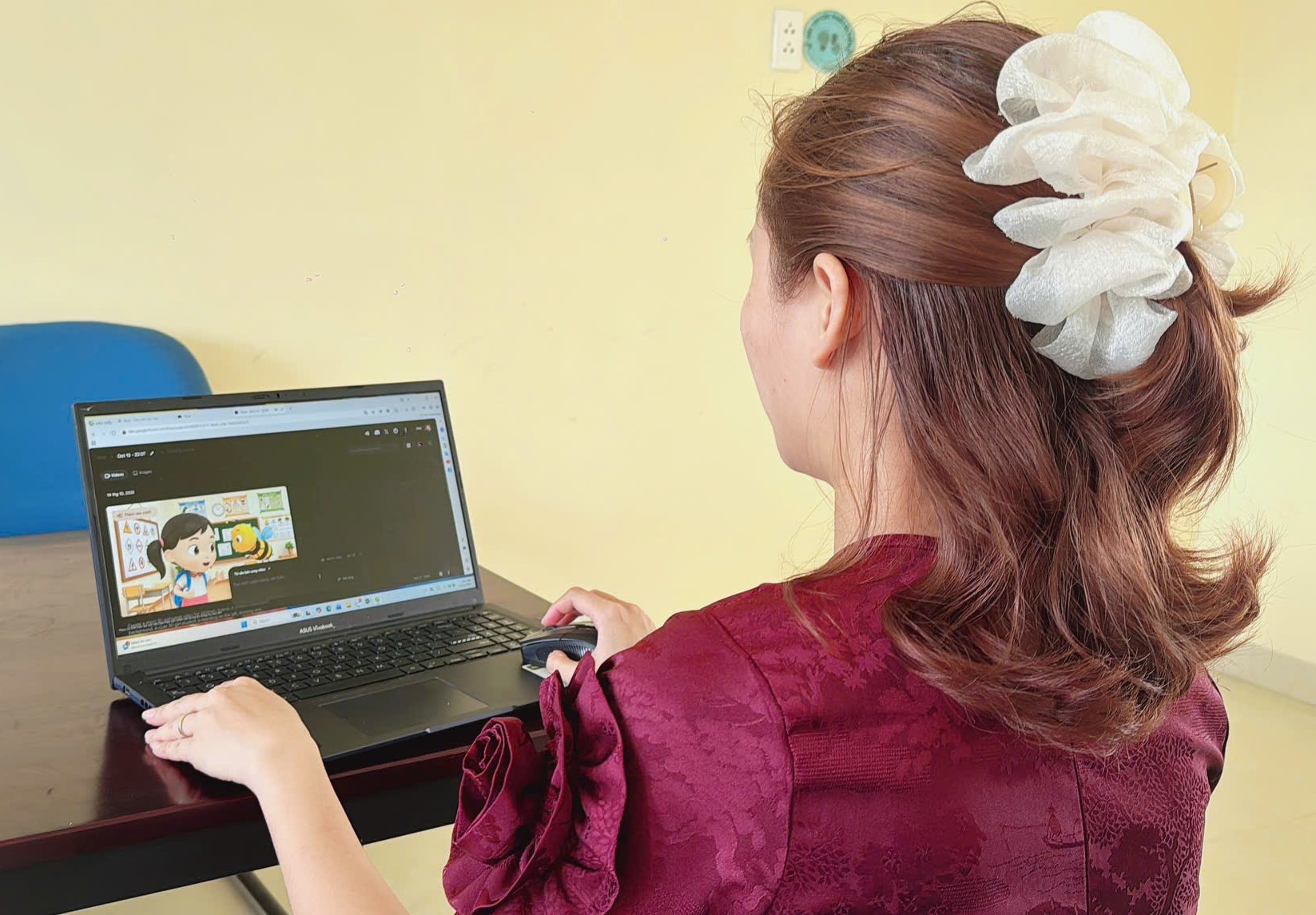 Giáo viên trường Tiểu học Phú Đông tiến hành soạn bài giảng, câu hỏi tương tác trên ứng dụng do nhóm thực hiện