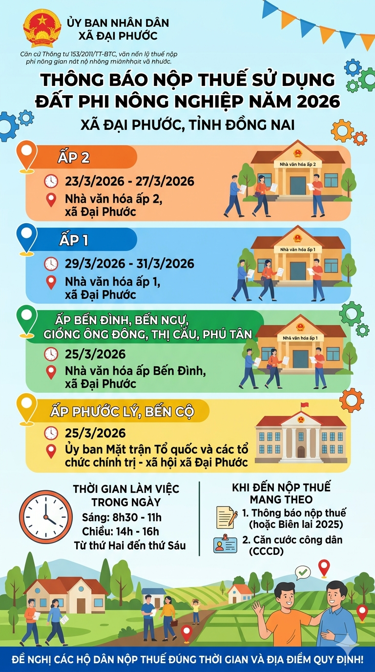 Ủy ban nhân dân xã Đại Phước thông báo thời gian, địa điểm tổ chức thu thuế sử dụng đất phi nông nghiệp năm 2026 đối với các tổ chức, hộ gia đình và cá nhân trên địa bàn xã, đề nghị các hộ dân thực hiện nộp thuế đúng thời gian quy định.