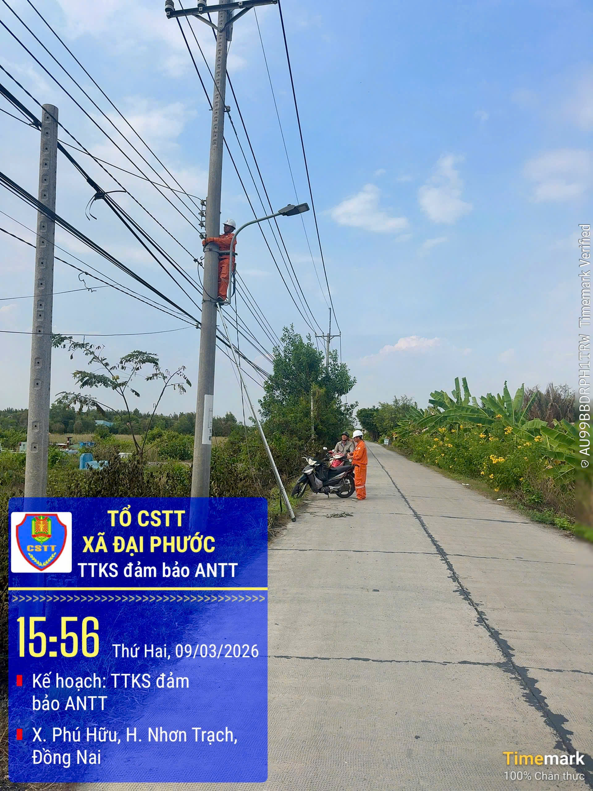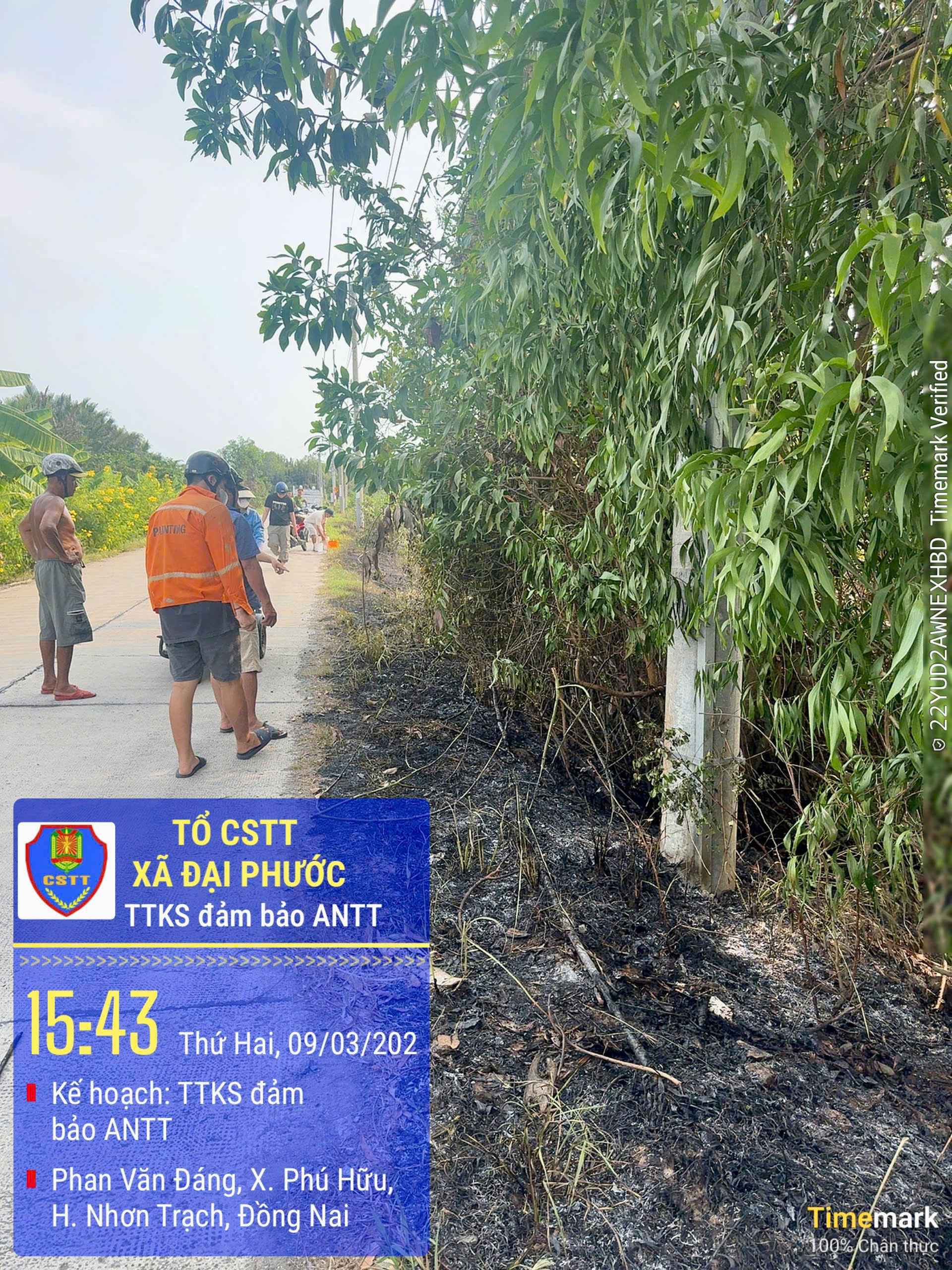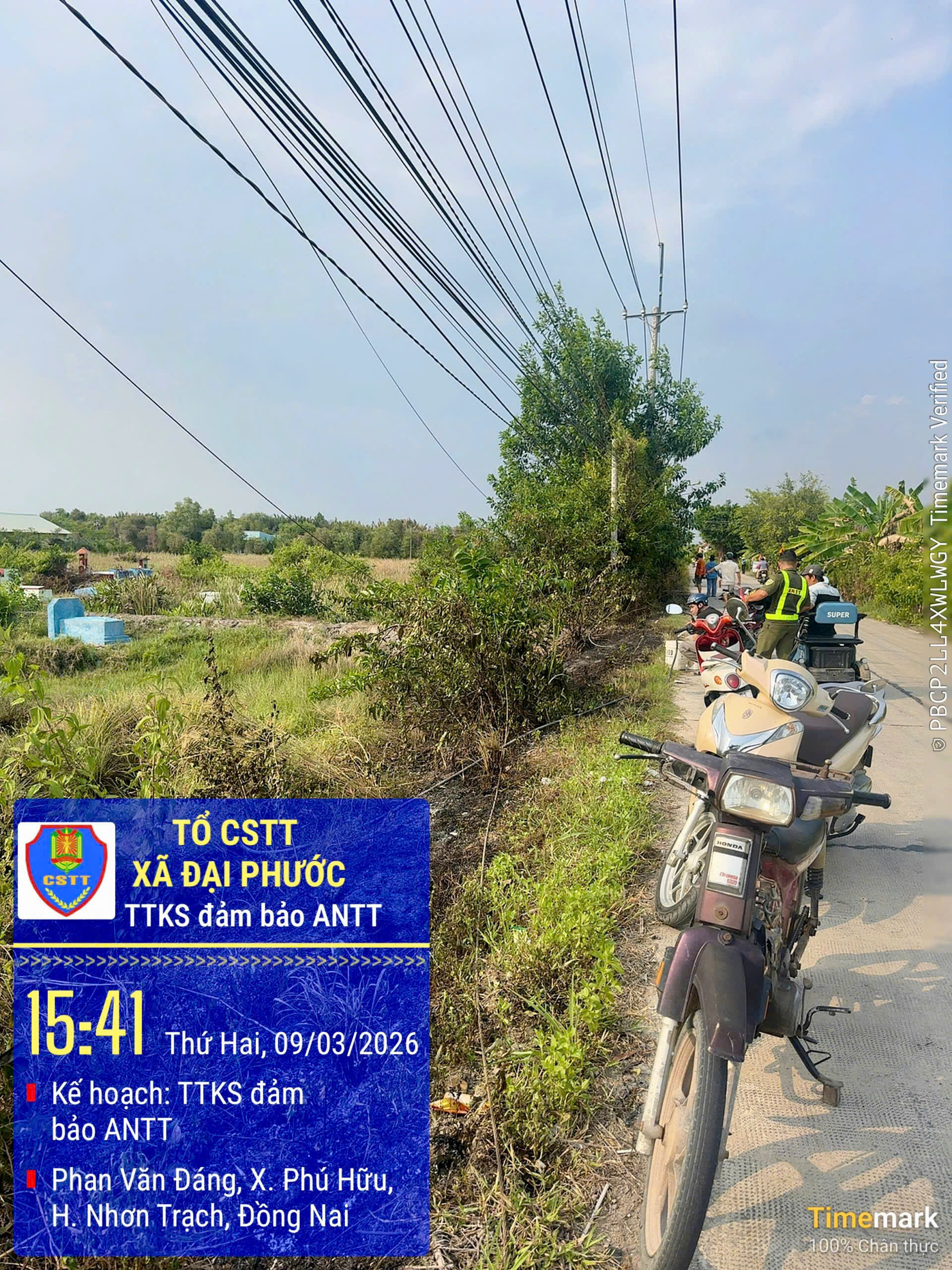 Chiều ngày 09/3/2026, trong quá trình thực hiện nhiệm vụ tuần tra, kiểm soát bảo đảm trật tự an toàn giao thông trên tuyến đường Phan Văn Đáng (đoạn thuộc ấp Rạch Bảy, xã Đại Phước), Tổ Cảnh sát trật tự Công an xã Đại Phước (tỉnh Đồng Nai) đã phát hiện sự cố đứt cáp, dây điện gây cháy trên đoạn dài khoảng 100 mét.