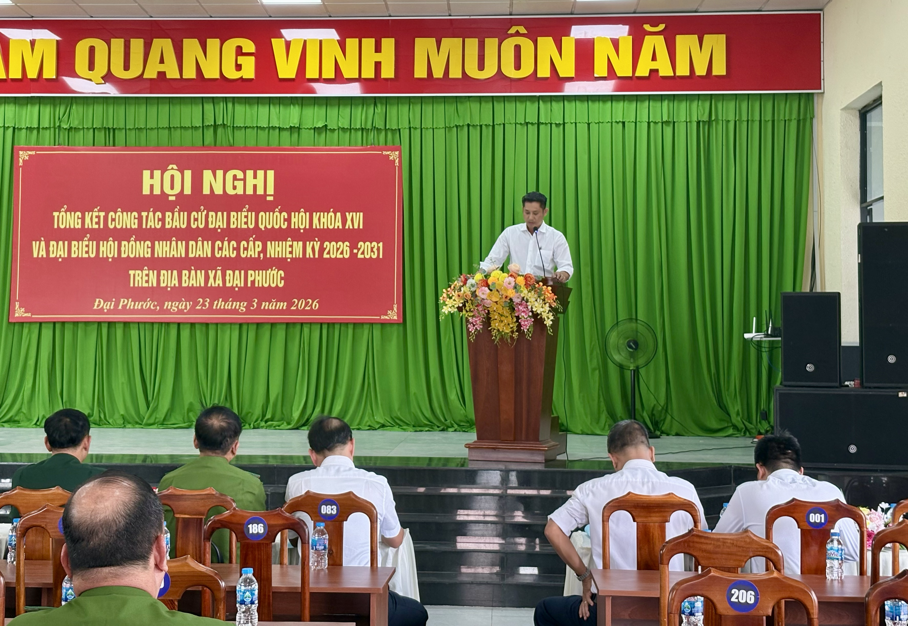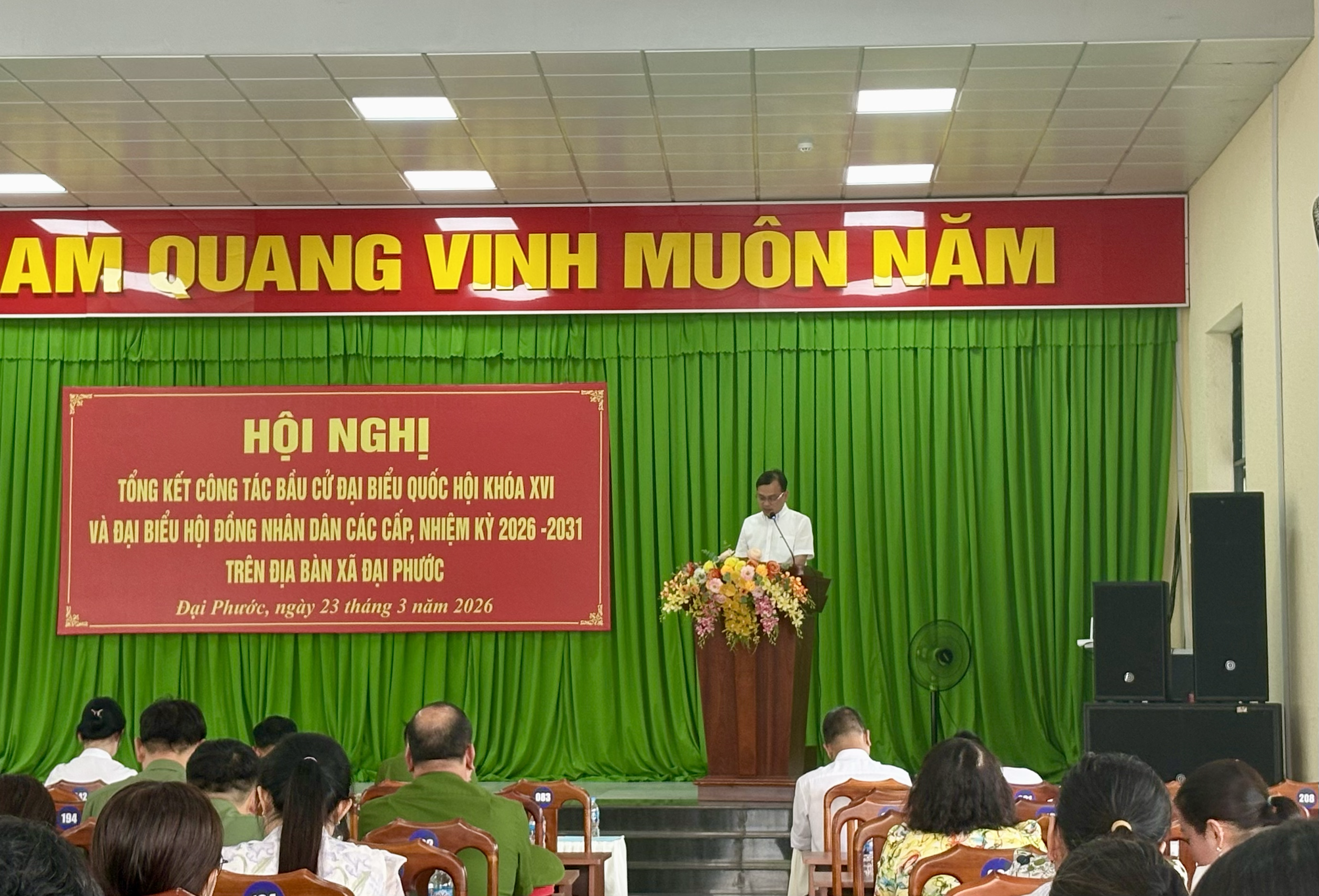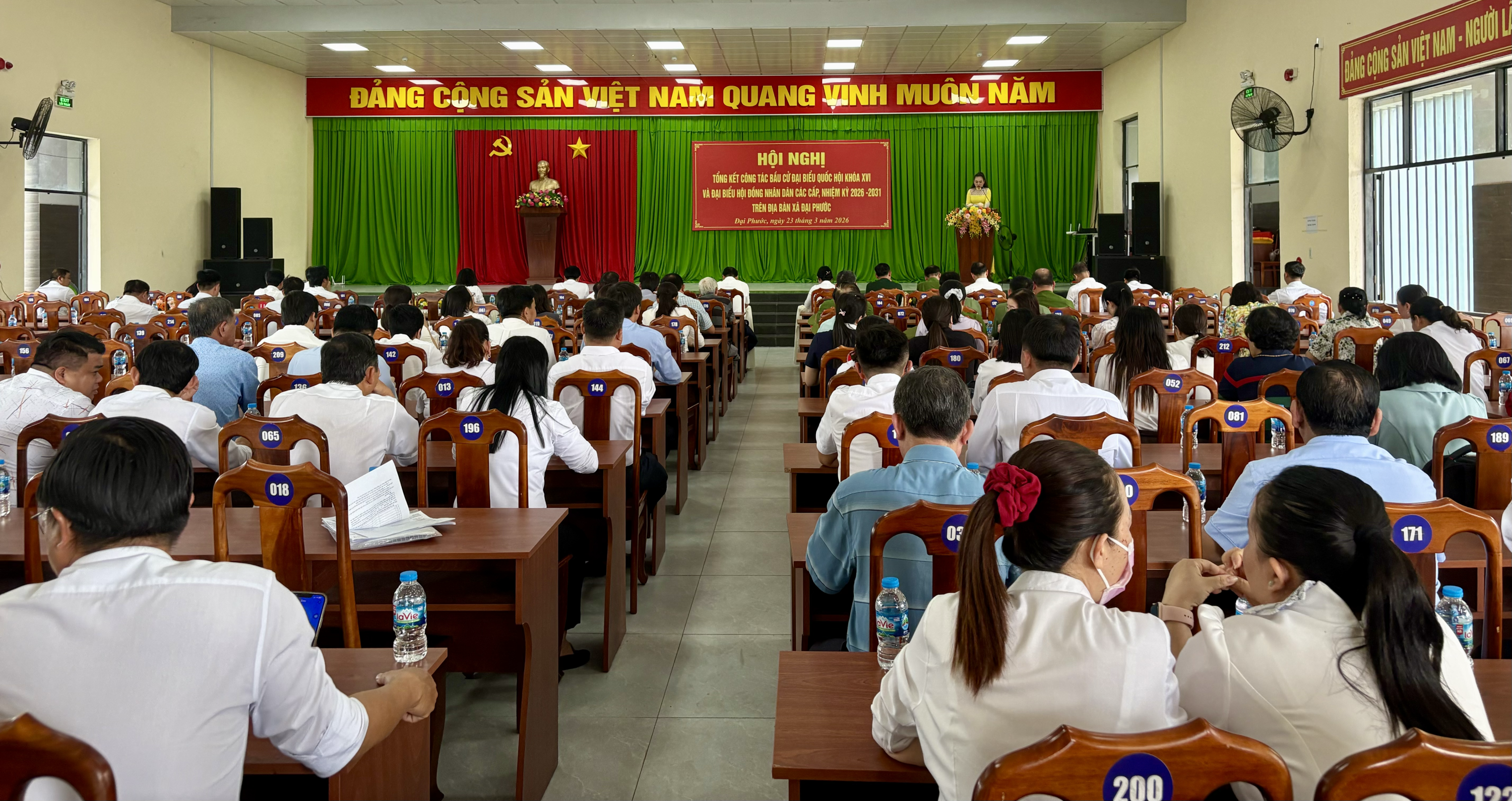 <figure class="image"><img style="aspect-ratio:3000/1589;" src="https://daiphuoc.dongnai.gov.vn/uploads/daiphuoc/news/2026_03/image_135.png" width="3000" height="1589" /></figure><p style="text-align:center;">Hình ảnh hội nghị</p><p style="text-align:justify;">Tại hội nghị, các đại biểu đã nghe báo cáo tổng kết công tác bầu cử do đồng chí Đỗ Hoàng Thân trình bày. Báo cáo nêu rõ, công tác bầu cử trên địa bàn xã Đại Phước đã được triển khai nghiêm túc, bài bản, đúng quy định pháp luật và đúng tiến độ đề ra. Ngay từ sớm, cấp ủy, chính quyền địa phương đã xác định đây là nhiệm vụ chính trị trọng tâm, từ đó tập trung lãnh đạo, chỉ đạo chặt chẽ, đồng bộ.&nbsp;</p><figure class="image"><img style="aspect-ratio:3000/2068;" src="https://daiphuoc.dongnai.gov.vn/uploads/daiphuoc/news/2026_03/image_136.png" width="3000" height="2068" /></figure><p style="text-align:center;">Hình ảnh đ/c Đỗ Hoàng Thân phát biểu Báo cáo</p><p style="text-align:justify;">Công tác chuẩn bị được thực hiện chu đáo với việc tổ chức nhiều hội nghị triển khai, tập huấn nghiệp vụ, diễn tập bầu cử; thành lập đầy đủ các tổ chức phụ trách bầu cử gồm 08 Ban bầu cử và 33 Tổ bầu cử. Bên cạnh đó, công tác hiệp thương, giới thiệu người ứng cử được tiến hành dân chủ, công khai, đúng quy trình, đảm bảo cơ cấu, thành phần theo quy định.&nbsp;</p><p style="text-align:justify;">Hoạt động tiếp xúc cử tri, vận động bầu cử được triển khai rộng khắp với hàng chục hội nghị, thu hút đông đảo cử tri tham dự. Công tác tuyên truyền được đẩy mạnh bằng nhiều hình thức phong phú, góp phần nâng cao nhận thức và tạo sự đồng thuận cao trong nhân dân. Đặc biệt, ngày bầu cử 15/3/2026 thực sự trở thành “ngày hội của toàn dân”, với tỷ lệ cử tri tham gia đạt 100%.&nbsp;</p><p style="text-align:justify;">Công tác đảm bảo an ninh chính trị, trật tự an toàn xã hội được giữ vững; không phát sinh khiếu nại, tố cáo liên quan đến bầu cử. Việc tổ chức bầu cử diễn ra an toàn, đúng luật, tiết kiệm và hiệu quả.&nbsp;</p><p style="text-align:justify;">Hội nghị cũng đã công bố Nghị quyết về kết quả bầu cử và danh sách những người trúng cử đại biểu HĐND xã Đại Phước khóa XIII, nhiệm kỳ 2026–2031. Theo đó, các đại biểu trúng cử đều đảm bảo tiêu chuẩn, cơ cấu, đại diện cho ý chí, nguyện vọng của nhân dân địa phương.&nbsp;</p><figure class="image"><img style="aspect-ratio:2757/1874;" src="https://daiphuoc.dongnai.gov.vn/uploads/daiphuoc/news/2026_03/image_137.png" width="2757" height="1874" /></figure><p style="text-align:center;">Hình ảnh đ/c Phan Chí Thảo công bố Nghị quyết</p><figure class="image"><img style="aspect-ratio:3000/1769;" src="https://daiphuoc.dongnai.gov.vn/uploads/daiphuoc/news/2026_03/image_138.png" width="3000" height="1769" /></figure><p style="text-align:center;">Hình ảnh đ/c Lê Thị Thanh Hồng công bố danh sách khen thưởng</p><p style="text-align:justify;">Dịp này, UBND xã đã khen thưởng cho 20 tập thể và 192 cá nhân có thành tích xuất sắc trong công tác bầu cử, góp phần vào thành công chung của cuộc bầu cử trên địa bàn.&nbsp;</p><p style="text-align:justify;">Hình ảnh khen thưởng các Tập thể:</p><figure class="image"><img style="aspect-ratio:3000/2250;" src="https://daiphuoc.dongnai.gov.vn/uploads/daiphuoc/news/2026_03/image_139.png" width="3000" height="2250" /></figure><figure class="image"><img style="aspect-ratio:3000/1902;" src="https://daiphuoc.dongnai.gov.vn/uploads/daiphuoc/news/2026_03/image_142.png" width="3000" height="1902" /></figure><p>&nbsp;</p><p>Hình ảnh khen thưởng các cá nhân:</p><figure class="image"><img style="aspect-ratio:3000/2250;" src="https://daiphuoc.dongnai.gov.vn/uploads/daiphuoc/news/2026_03/image_143.png" width="3000" height="2250" /></figure><figure class="image"><img style="aspect-ratio:3000/1846;" src="https://daiphuoc.dongnai.gov.vn/uploads/daiphuoc/news/2026_03/image_144.png" width="3000" height="1846" /></figure><figure class="image"><img style="aspect-ratio:3000/1591;" src="https://daiphuoc.dongnai.gov.vn/uploads/daiphuoc/news/2026_03/image_146.png" width="3000" height="1591" /></figure><figure class="image"><img style="aspect-ratio:3000/2250;" src="https://daiphuoc.dongnai.gov.vn/uploads/daiphuoc/news/2026_03/image_147.png" width="3000" height="2250" /></figure><figure class="image"><img style="aspect-ratio:3000/2250;" src="https://daiphuoc.dongnai.gov.vn/uploads/daiphuoc/news/2026_03/image_148.png" width="3000" height="2250" /></figure><p style="text-align:justify;">Phát biểu chỉ đạo tại hội nghị, đồng chí Nguyễn Thế Phong – Chủ tịch Ủy ban bầu cử xã ghi nhận và biểu dương tinh thần trách nhiệm của cả hệ thống chính trị và sự hưởng ứng tích cực của nhân dân trong suốt quá trình tổ chức bầu cử. Đồng thời nhấn việc áp dụng Công nghệ thông tin vào công tác bầu cử, những bài học kinh nghiệm quan trọng như: tăng cường vai trò lãnh đạo của Đảng, nâng cao hiệu quả phối hợp giữa các cơ quan, chú trọng công tác tuyên truyền và đảm bảo thực hiện đúng quy trình, quy định pháp luật.&nbsp;</p><figure class="image"><img style="aspect-ratio:3000/1578;" src="https://daiphuoc.dongnai.gov.vn/uploads/daiphuoc/news/2026_03/image_149.png" width="3000" height="1578" /></figure><p s