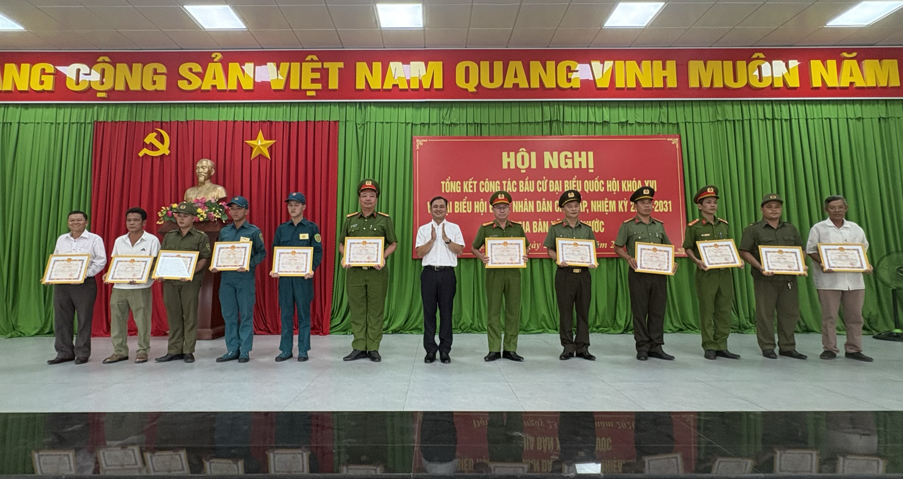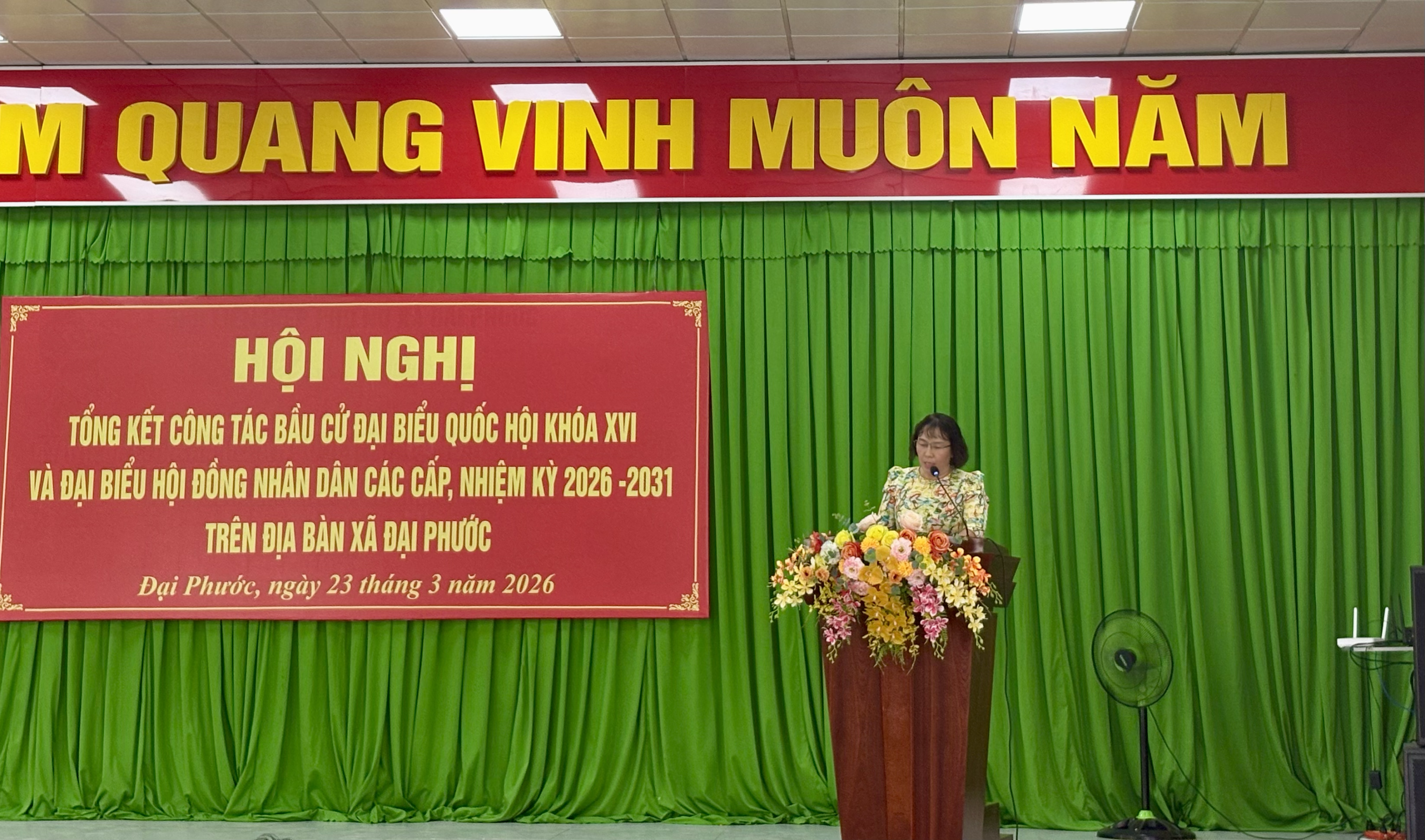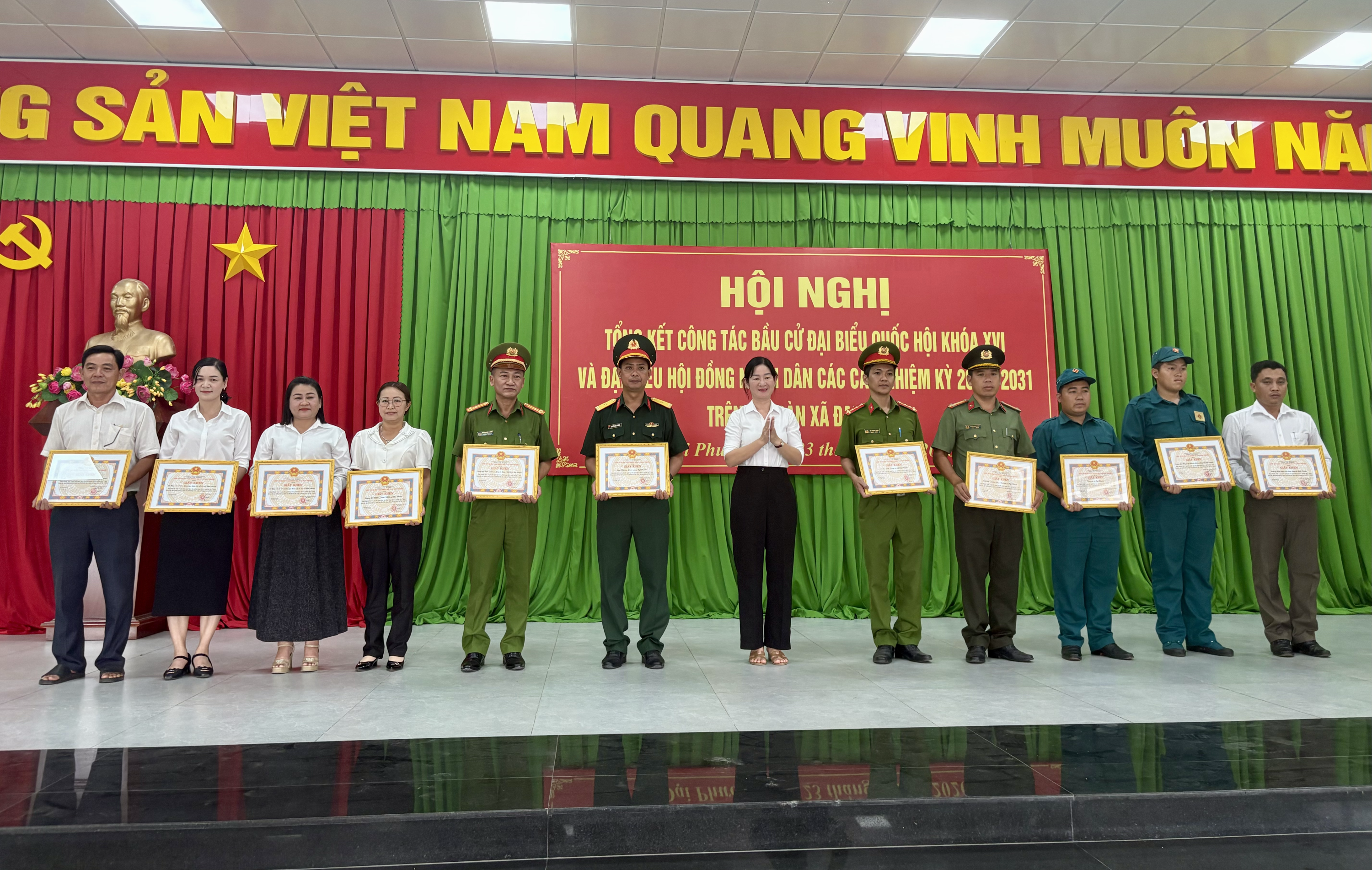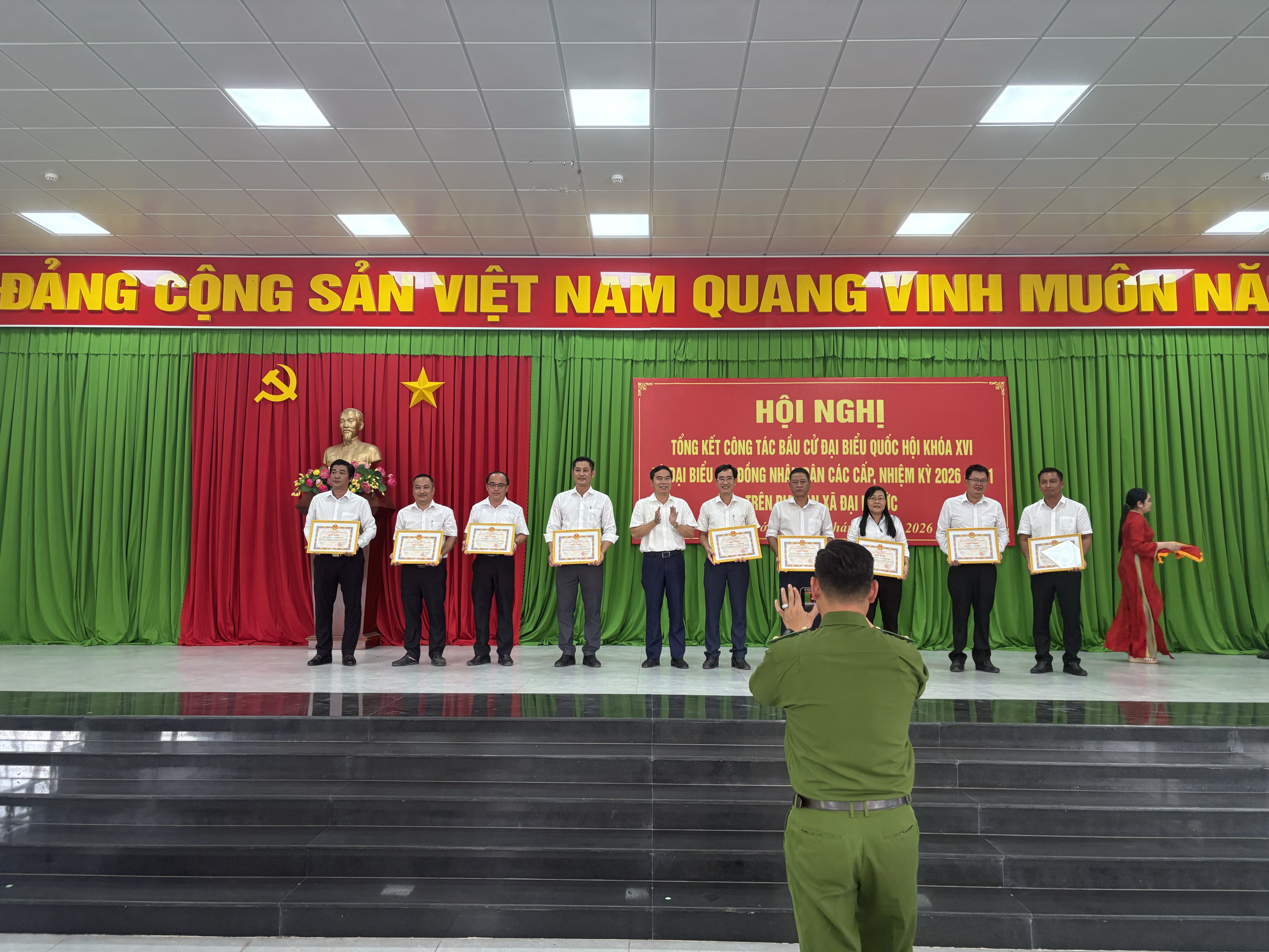<figure class="image"><img style="aspect-ratio:3000/1589;" src="https://daiphuoc.dongnai.gov.vn/uploads/daiphuoc/news/2026_03/image_135.png" width="3000" height="1589" /></figure><p style="text-align:center;">Hình ảnh hội nghị</p><p style="text-align:justify;">Tại hội nghị, các đại biểu đã nghe báo cáo tổng kết công tác bầu cử do đồng chí Đỗ Hoàng Thân trình bày. Báo cáo nêu rõ, công tác bầu cử trên địa bàn xã Đại Phước đã được triển khai nghiêm túc, bài bản, đúng quy định pháp luật và đúng tiến độ đề ra. Ngay từ sớm, cấp ủy, chính quyền địa phương đã xác định đây là nhiệm vụ chính trị trọng tâm, từ đó tập trung lãnh đạo, chỉ đạo chặt chẽ, đồng bộ.&nbsp;</p><figure class="image"><img style="aspect-ratio:3000/2068;" src="https://daiphuoc.dongnai.gov.vn/uploads/daiphuoc/news/2026_03/image_136.png" width="3000" height="2068" /></figure><p style="text-align:center;">Hình ảnh đ/c Đỗ Hoàng Thân phát biểu Báo cáo</p><p style="text-align:justify;">Công tác chuẩn bị được thực hiện chu đáo với việc tổ chức nhiều hội nghị triển khai, tập huấn nghiệp vụ, diễn tập bầu cử; thành lập đầy đủ các tổ chức phụ trách bầu cử gồm 08 Ban bầu cử và 33 Tổ bầu cử. Bên cạnh đó, công tác hiệp thương, giới thiệu người ứng cử được tiến hành dân chủ, công khai, đúng quy trình, đảm bảo cơ cấu, thành phần theo quy định.&nbsp;</p><p style="text-align:justify;">Hoạt động tiếp xúc cử tri, vận động bầu cử được triển khai rộng khắp với hàng chục hội nghị, thu hút đông đảo cử tri tham dự. Công tác tuyên truyền được đẩy mạnh bằng nhiều hình thức phong phú, góp phần nâng cao nhận thức và tạo sự đồng thuận cao trong nhân dân. Đặc biệt, ngày bầu cử 15/3/2026 thực sự trở thành “ngày hội của toàn dân”, với tỷ lệ cử tri tham gia đạt 100%.&nbsp;</p><p style="text-align:justify;">Công tác đảm bảo an ninh chính trị, trật tự an toàn xã hội được giữ vững; không phát sinh khiếu nại, tố cáo liên quan đến bầu cử. Việc tổ chức bầu cử diễn ra an toàn, đúng luật, tiết kiệm và hiệu quả.&nbsp;</p><p style="text-align:justify;">Hội nghị cũng đã công bố Nghị quyết về kết quả bầu cử và danh sách những người trúng cử đại biểu HĐND xã Đại Phước khóa XIII, nhiệm kỳ 2026–2031. Theo đó, các đại biểu trúng cử đều đảm bảo tiêu chuẩn, cơ cấu, đại diện cho ý chí, nguyện vọng của nhân dân địa phương.&nbsp;</p><figure class="image"><img style="aspect-ratio:2757/1874;" src="https://daiphuoc.dongnai.gov.vn/uploads/daiphuoc/news/2026_03/image_137.png" width="2757" height="1874" /></figure><p style="text-align:center;">Hình ảnh đ/c Phan Chí Thảo công bố Nghị quyết</p><figure class="image"><img style="aspect-ratio:3000/1769;" src="https://daiphuoc.dongnai.gov.vn/uploads/daiphuoc/news/2026_03/image_138.png" width="3000" height="1769" /></figure><p style="text-align:center;">Hình ảnh đ/c Lê Thị Thanh Hồng công bố danh sách khen thưởng</p><p style="text-align:justify;">Dịp này, UBND xã đã khen thưởng cho 20 tập thể và 192 cá nhân có thành tích xuất sắc trong công tác bầu cử, góp phần vào thành công chung của cuộc bầu cử trên địa bàn.&nbsp;</p><p style="text-align:justify;">Hình ảnh khen thưởng các Tập thể:</p><figure class="image"><img style="aspect-ratio:3000/2250;" src="https://daiphuoc.dongnai.gov.vn/uploads/daiphuoc/news/2026_03/image_139.png" width="3000" height="2250" /></figure><figure class="image"><img style="aspect-ratio:3000/1902;" src="https://daiphuoc.dongnai.gov.vn/uploads/daiphuoc/news/2026_03/image_142.png" width="3000" height="1902" /></figure><p>&nbsp;</p><p>Hình ảnh khen thưởng các cá nhân:</p><figure class="image"><img style="aspect-ratio:3000/2250;" src="https://daiphuoc.dongnai.gov.vn/uploads/daiphuoc/news/2026_03/image_143.png" width="3000" height="2250" /></figure><figure class="image"><img style="aspect-ratio:3000/1846;" src="https://daiphuoc.dongnai.gov.vn/uploads/daiphuoc/news/2026_03/image_144.png" width="3000" height="1846" /></figure><figure class="image"><img style="aspect-ratio:3000/1591;" src="https://daiphuoc.dongnai.gov.vn/uploads/daiphuoc/news/2026_03/image_146.png" width="3000" height="1591" /></figure><figure class="image"><img style="aspect-ratio:3000/2250;" src="https://daiphuoc.dongnai.gov.vn/uploads/daiphuoc/news/2026_03/image_147.png" width="3000" height="2250" /></figure><figure class="image"><img style="aspect-ratio:3000/2250;" src="https://daiphuoc.dongnai.gov.vn/uploads/daiphuoc/news/2026_03/image_148.png" width="3000" height="2250" /></figure><p style="text-align:justify;">Phát biểu chỉ đạo tại hội nghị, đồng chí Nguyễn Thế Phong – Chủ tịch Ủy ban bầu cử xã ghi nhận và biểu dương tinh thần trách nhiệm của cả hệ thống chính trị và sự hưởng ứng tích cực của nhân dân trong suốt quá trình tổ chức bầu cử. Đồng thời nhấn việc áp dụng Công nghệ thông tin vào công tác bầu cử, những bài học kinh nghiệm quan trọng như: tăng cường vai trò lãnh đạo của Đảng, nâng cao hiệu quả phối hợp giữa các cơ quan, chú trọng công tác tuyên truyền và đảm bảo thực hiện đúng quy trình, quy định pháp luật.&nbsp;</p><figure class="image"><img style="aspect-ratio:3000/1578;" src="https://daiphuoc.dongnai.gov.vn/uploads/daiphuoc/news/2026_03/image_149.png" width="3000" height="1578" /></figure><p s