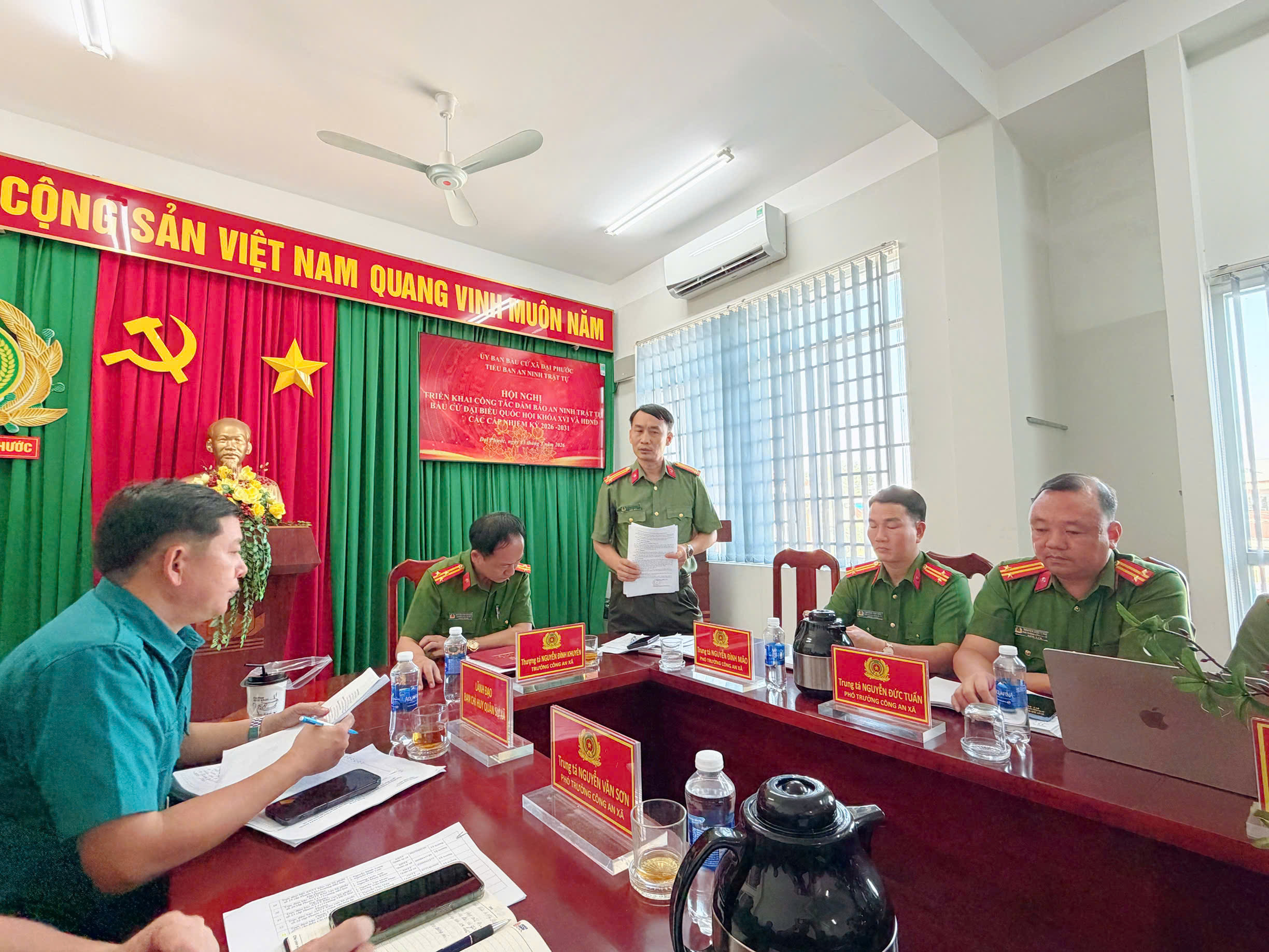 <figure class="image"><img style="aspect-ratio:605/340;" src="https://daiphuoc.dongnai.gov.vn/uploads/daiphuoc/news/2026_03/image_68.jpeg" width="605" height="340" /></figure><p style="margin-left:0in;text-align:center;"><strong>Toàn cảnh Hội nghị</strong></p><p style="margin-left:0in;text-align:justify;">Hội nghị do đồng chí Thượng tá Nguyễn Đình Khuyên – Ủy viên Ban Thường vụ Đảng ủy xã, Bí thư Đảng ủy, Trưởng Công an xã, Trưởng Tiểu ban An ninh trật tự chủ trì. Tham dự hội nghị có các thành viên Tiểu ban An ninh trật tự; cán bộ chiến sĩ Công an xã; lực lượng Quân sự, Dân quân tự vệ và lực lượng tham gia bảo vệ an ninh trật tự ở cơ sở.</p><figure class="image"><img style="aspect-ratio:605/453;" src="https://daiphuoc.dongnai.gov.vn/uploads/daiphuoc/news/2026_03/image_72.jpeg" width="605" height="453" /></figure><p style="margin-left:0in;text-align:center;"><strong>Đồng chí Trung tá Nguyễn Đình Mão – Phó Trưởng Công an xã triển khai các phương án đảm bảo an ninh trật tự</strong></p><p style="margin-left:0in;text-align:justify;">Tại hội nghị, các đại biểu đã được quán triệt, triển khai các nội dung, kế hoạch bảo đảm an ninh trật tự trước, trong và sau thời gian diễn ra bầu cử; tập trung đánh giá, dự báo tình hình, chủ động nắm chắc địa bàn, đối tượng; kịp thời phát hiện, phòng ngừa và đấu tranh với các loại tội phạm, hành vi vi phạm pháp luật có thể ảnh hưởng đến công tác bầu cử. Đồng thời, phân công lực lượng, xây dựng phương án bảo vệ cụ thể, tăng cường công tác tuần tra, kiểm soát, bảo đảm an ninh, an toàn tại các khu vực bỏ phiếu.</p><figure class="image"><img style="aspect-ratio:605/453;" src="https://daiphuoc.dongnai.gov.vn/uploads/daiphuoc/news/2026_03/image_71.jpeg" width="605" height="453" /></figure><p style="margin-left:0in;text-align:center;"><strong>Đồng chí Thượng tá Nguyễn Đình Khuyên – Ủy viên Ban Thường vụ Đảng ủy xã, Bí thư Đảng ủy, Trưởng Công an xã, Trưởng Tiểu ban an ninh trật tự phát biểu chỉ đạo kết luận Hội nghị</strong></p><p style="margin-left:0in;text-align:justify;">Theo kế hoạch, trên địa bàn xã Đại Phước có 33 khu vực bỏ phiếu. Tiểu ban An ninh trật tự đã chủ động xây dựng các phương án bảo vệ phù hợp với tình hình thực tế của từng địa bàn, bảo đảm an ninh, an toàn tuyệt đối cho cử tri tham gia bầu cử, góp phần để cuộc bầu cử diễn ra dân chủ, đúng pháp luật, an toàn và thành công tốt đẹp.</p><figure class="image"><img style="aspect-ratio:605/453;" src="https://daiphuoc.dongnai.gov.vn/uploads/daiphuoc/news/2026_03/image_70.jpeg" width="605" height="453" /></figure><figure class="image"><img style="aspect-ratio:605/453;" src="https://daiphuoc.dongnai.gov.vn/uploads/daiphuoc/news/2026_03/image_69.jpeg" width="605" height="453" /></figure><p style="margin-left:0in;text-align:center;"><strong>Tiểu ban ANTT kiểm tra công tác đảm bảo ANTT tại khu vực bỏ phiếu số 28, ấp Cát Lái</strong></p><p style="margin-left:0in;text-align:justify;">Ngay sau khi kết thúc hội nghị, Tiểu ban An ninh trật tự xã Đại Phước đã tổ chức kiểm tra thực tế công tác, phương án và lực lượng bảo đảm an ninh trật tự tại một số khu vực bỏ phiếu trên địa bàn. Qua kiểm tra nhằm kịp thời rà soát, đánh giá điều kiện cơ sở vật chất, phương án bố trí lực lượng, các yếu tố liên quan đến công tác bảo vệ, từ đó chủ động bổ sung, điều chỉnh các phương án phù hợp, bảo đảm sẵn sàng triển khai nhiệm vụ, giữ vững an ninh trật tự, phục vụ tốt cho ngày bầu cử sắp tới.</p>