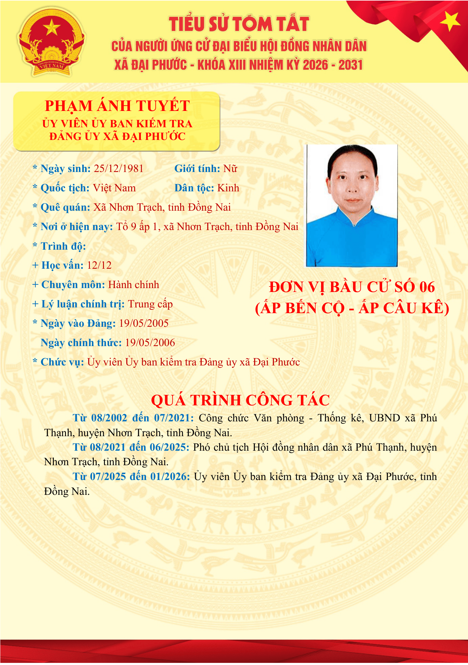 <p><span style="background-color:rgb(255,255,255);color:rgb(51,51,51);">Danh sách những người ứng cử Đại biểu HĐND xã Đại Phước khóa XIII, nhiệm kỳ 2026-2031 tại đơn vị bầu cử số 06 (ấp Bến Cộ và ấp Câu Kê)</span></p><figure class="image"><img style="aspect-ratio:1559/2200;" src="https://daiphuoc.dongnai.gov.vn/uploads/daiphuoc/news/2026_03/ngo-thanh-chung.png" width="1559" height="2200" /></figure><figure class="image"><img style="aspect-ratio:1548/2200;" src="https://daiphuoc.dongnai.gov.vn/uploads/daiphuoc/news/2026_03/doan-thi-loc.png" width="1548" height="2200" /></figure><figure class="image"><img style="aspect-ratio:1559/2200;" src="https://daiphuoc.dongnai.gov.vn/uploads/daiphuoc/news/2026_03/do-tan-phat.png" width="1559" height="2200" /></figure><figure class="image"><img style="aspect-ratio:1531/2200;" src="https://daiphuoc.dongnai.gov.vn/uploads/daiphuoc/news/2026_03/chau-thanh-phuong.png" width="1531" height="2200" /></figure><figure class="image"><img style="aspect-ratio:1548/2200;" src="https://daiphuoc.dongnai.gov.vn/uploads/daiphuoc/news/2026_03/pham-anh-tuyet.png" width="1548" height="2200" /></figure>