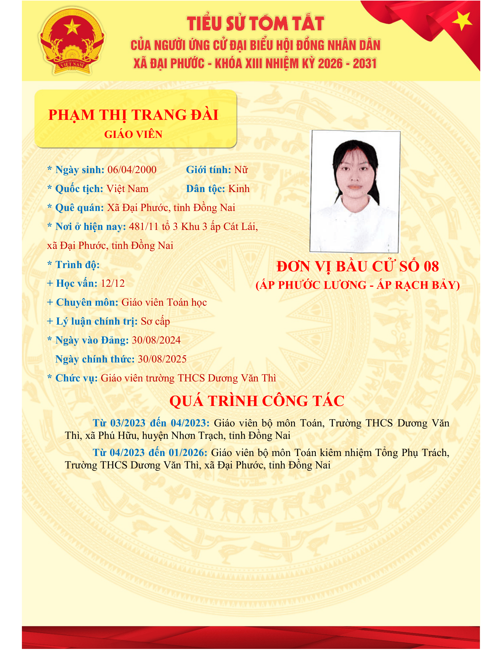 <p><span style="background-color:rgb(255,255,255);color:rgb(51,51,51);">Danh sách những người ứng cử Đại biểu HĐND xã Đại Phước khóa XIII, nhiệm kỳ 2026-2031 tại đơn vị bầu cử số 04 (ấp Phước Lương và ấp Rạch Bảy)</span></p><figure class="image"><img style="aspect-ratio:1553/2200;" src="https://daiphuoc.dongnai.gov.vn/uploads/daiphuoc/news/2026_03/pham-thi-ngoc-anh_1.png" width="1553" height="2200" /></figure><figure class="image"><img style="aspect-ratio:1700/2200;" src="https://daiphuoc.dongnai.gov.vn/uploads/daiphuoc/news/2026_03/pham-thi-trang-dai.png" width="1700" height="2200" /></figure><figure class="image"><img style="aspect-ratio:1543/2200;" src="https://daiphuoc.dongnai.gov.vn/uploads/daiphuoc/news/2026_03/tran-vu-huy.png" width="1543" height="2200" /></figure><figure class="image"><img style="aspect-ratio:1700/2200;" src="https://daiphuoc.dongnai.gov.vn/uploads/daiphuoc/news/2026_03/phan-chi-thao.png" width="1700" height="2200" /></figure><figure class="image"><img style="aspect-ratio:1542/2200;" src="https://daiphuoc.dongnai.gov.vn/uploads/daiphuoc/news/2026_03/tran-thuan-hong-tho.png" width="1542" height="2200" /></figure><p>&nbsp;</p>