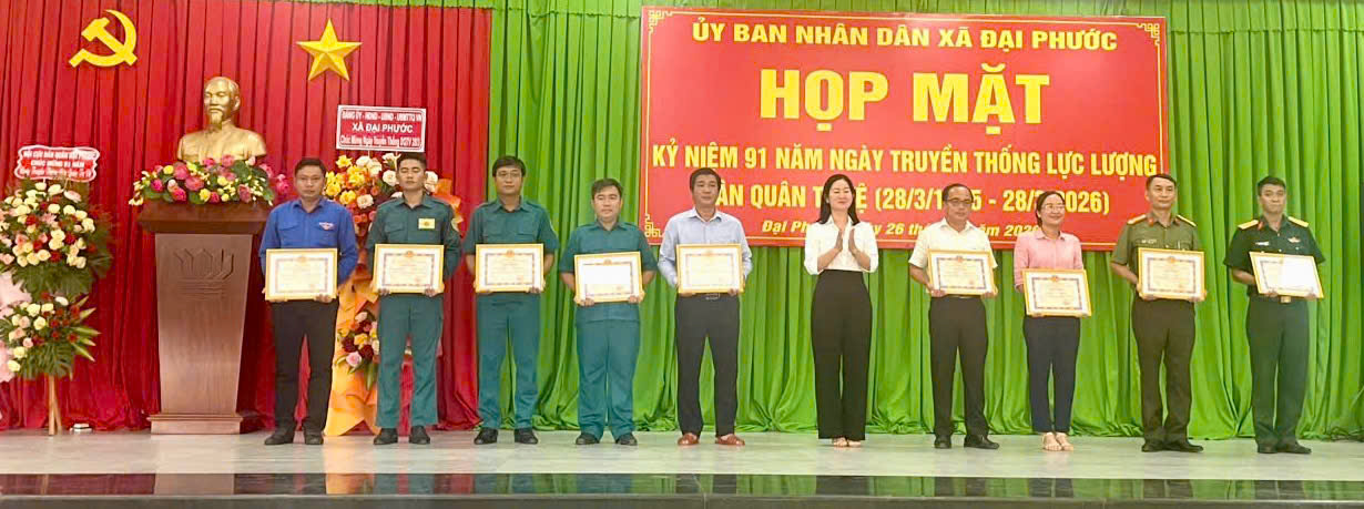 <p style="margin-left:0in;text-align:justify;">Tham dự buổi lễ có đại diện lãnh đạo Đảng ủy, Ủy ban nhân dân xã; Ban Chỉ huy Quân sự xã; Công an xã Đại Phước cùng các ban, ngành, đoàn thể và lực lượng dân quân tự vệ trên địa bàn. Trong thời gian qua, Công an xã Đại Phước đã phát huy vai trò nòng cốt trong công tác bảo đảm an ninh trật tự, chủ động phối hợp chặt chẽ với Ban Chỉ huy Quân sự xã triển khai hiệu quả quy chế phối hợp. Hai lực lượng thường xuyên trao đổi thông tin, nắm chắc tình hình địa bàn; tổ chức tuần tra, kiểm soát, kịp thời phát hiện, xử lý các vụ việc phát sinh; tích cực tham gia xây dựng lực lượng dân quân tự vệ ngày càng vững mạnh. Qua đó, góp phần giữ vững ổn định chính trị, bảo đảm trật tự an toàn xã hội, phục vụ hiệu quả nhiệm vụ phát triển kinh tế – xã hội tại địa phương.</p><p style="margin-left:0in;text-align:justify;">Ghi nhận những đóng góp tích cực trong công tác phối hợp, Ủy ban nhân dân xã Đại Phước đã biểu dương, khen thưởng Công an xã Đại Phước. Nhân dịp này, Công an xã Đại Phước trao tặng Giấy khen cho 01 tập thể và 01 cá nhân có thành tích xuất sắc, tiêu biểu trong thực hiện nhiệm vụ.</p><figure class="image"><img style="aspect-ratio:604/225;" src="https://daiphuoc.dongnai.gov.vn/uploads/daiphuoc/news/2026_03/image_155.jpeg" width="604" height="225" /></figure><figure class="image"><img style="aspect-ratio:604/223;" src="https://daiphuoc.dongnai.gov.vn/uploads/daiphuoc/news/2026_03/image_154.jpeg" width="604" height="223" /></figure><p style="margin-left:0in;text-align:center;"><strong>Hình ảnh tập thể Công an xã và cá nhân cán bộ chiến sĩ được khen thưởng tại Lễ kỷ niệm</strong></p><p style="margin-left:0in;text-align:justify;">Trong thời gian tới, Công an xã Đại Phước tiếp tục phát huy vai trò nòng cốt, tăng cường phối hợp chặt chẽ với lực lượng Quân sự, chủ động nắm chắc tình hình, kịp thời tham mưu xử lý hiệu quả các vấn đề phát sinh từ cơ sở, góp phần giữ vững an ninh trật tự trên địa bàn.</p>