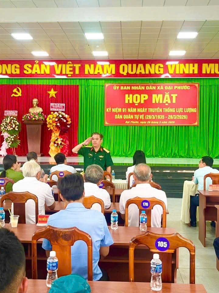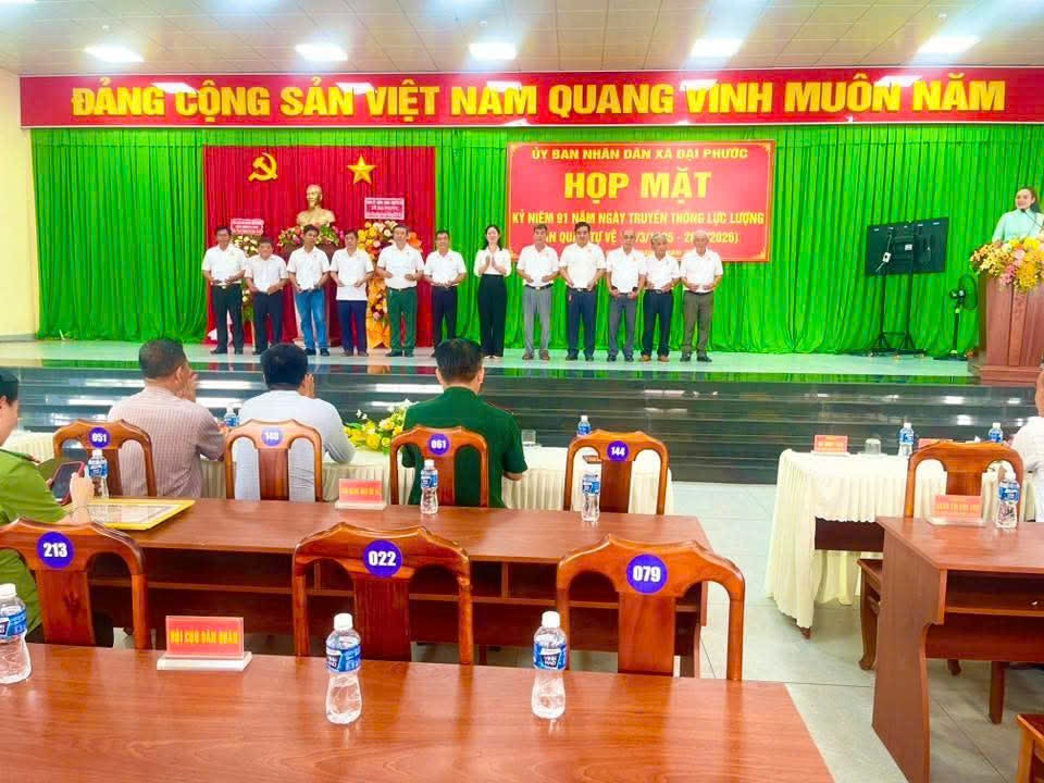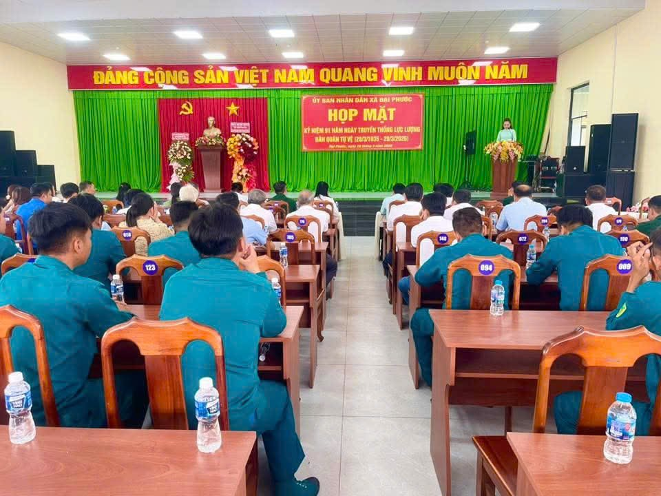 <p style="margin-left:0in;text-align:justify;">&nbsp;</p><figure class="image"><img style="aspect-ratio:636/357;" src="https://daiphuoc.dongnai.gov.vn/uploads/daiphuoc/news/2026_03/image_190.png" width="636" height="357" /></figure><p style="margin-left:0in;text-align:center;"><i>Quang cảnh buổi họp mặt</i></p><p style="margin-left:0in;text-align:justify;">Tham dự chương trình có sự hiện diện Đ/c Trung tá Trần Nhất Trung – Phó chỉ huy trưởng, tham mưu trưởng BCH phòng thủ khu vực I – Long Thành, Lãnh đạo xã có sự hiện diện Đ/c Trần Trương Chung – Phó bí thư TT Đảng ủy, Đ/c Hồ Quốc Tân – Phó bí thư – Chủ tịch UBND xã cùng đại diện Đảng ủy – HĐND – UBND – UBMTTQ xã,&nbsp;các đ/c là UVBTV Đảng ủy, Ủy viên Ban Chấp hành Đảng bộ xã, lãnh đạo các cơ quan ban ngành đoàn thể và các đồng chí trong Ban chỉ huy quân sự xã các đ/c là Bí thư ấp, Trưởng ấp, ấp đội trưởng, tập thể và cá nhân được khen thưởng, các đồng chí Hội cựu dân quân xã..&nbsp;</p><figure class="image"><img style="aspect-ratio:549/505;" src="https://daiphuoc.dongnai.gov.vn/uploads/daiphuoc/news/2026_03/image_189.png" width="549" height="505" /></figure><p style="text-align:center;"><i>Đ/c Trung tá Trần Nhất Trung – Phó chỉ huy trưởng, tham mưu trưởng BCH phòng thủ khu vực I – Long Thành tham dự&nbsp;</i></p><figure class="image"><img style="aspect-ratio:579/380;" src="https://daiphuoc.dongnai.gov.vn/uploads/daiphuoc/news/2026_03/image_193.png" width="579" height="380" /></figure><p style="margin-left:0in;text-align:center;"><i>Đại diện Lãnh đạo Đảng ủy – HĐND – UBND – UBMTTQ VN xã&nbsp;</i></p><p style="margin-left:0in;text-align:center;"><i>Tặng hoa chúc mừng</i></p><figure class="image"><img style="aspect-ratio:598/289;" src="https://daiphuoc.dongnai.gov.vn/uploads/daiphuoc/news/2026_03/image_191.png" width="598" height="289" /></figure><p style="margin-left:0in;text-align:center;"><i>Hội cựu dân quân Tặng cho chúc mừng</i></p><p style="margin-left:0in;text-align:justify;">Tại buổi họp mặt, các đại biểu đã cùng nhau ôn lại truyền thống vẻ vang của lực lượng Dân quân tự vệ Việt Nam qua 91 năm xây dựng, chiến đấu và trưởng thành. Trải qua các thời kỳ cách mạng, lực lượng Dân quân tự vệ luôn là lực lượng nòng cốt trong chiến tranh nhân dân, góp phần quan trọng vào sự nghiệp đấu tranh giải phóng dân tộc, bảo vệ Tổ quốc và giữ gìn an ninh chính trị, trật tự an toàn xã hội ở địa phương.</p><figure class="image"><img style="aspect-ratio:534/261;" src="https://daiphuoc.dongnai.gov.vn/uploads/daiphuoc/news/2026_03/image_195.png" width="534" height="261" /></figure><p style="margin-left:0in;text-align:center;"><i>Đ/c Thiếu tá Nguyễn Văn Phương – UVTV - &nbsp;Chỉ huy Trưởng BCHQS xã&nbsp;</i></p><p style="margin-left:0in;text-align:center;"><i>ôn lại truyền thống</i></p><p style="margin-left:0in;text-align:justify;">Phát huy truyền thống anh hùng đó, trong thời gian qua, lực lượng Dân quân tự vệ xã Đại Phước đã không ngừng được củng cố, xây dựng vững mạnh về mọi mặt. Lực lượng luôn chủ động phối hợp với Công an, Quân sự xã trong công tác tuần tra, giữ gìn an ninh trật tự, tham gia phòng chống thiên tai, tìm kiếm cứu nạn, góp phần bảo vệ cuộc sống bình yên cho nhân dân. Đồng thời, tích cực tham gia các phong trào thi đua yêu nước, xây dựng nông thôn mới, thực hiện tốt nhiệm vụ quốc phòng – an ninh tại địa phương.</p><p style="margin-left:0in;text-align:justify;">Đại diện lãnh đạo Đảng ủy Đ/c Trần Trương Chung -&nbsp;Phó bí thư Thường trực Đảng ủy đã phát biểu ý kiến chỉ đạo,&nbsp;ghi nhận và biểu dương những đóng góp tích cực của lực lượng Dân quân tự vệ trong thời gian qua, đồng thời đề nghị lực lượng tiếp tục phát huy tinh thần trách nhiệm, nâng cao chất lượng huấn luyện, sẵn sàng chiến đấu, đáp ứng yêu cầu nhiệm vụ trong tình hình mới.</p><p style="margin-left:0in;text-align:justify;">Dịp này, UBND xã Đại Phước đã có quyết định trao giấy khen cho 10 tập thể, và 20 cá nhân có thành tích tiêu biểu trong xây dựng và hoạt động của lực lượng Dân quân tự vệ, qua đó động viên, khích lệ tinh thần cán bộ, chiến sĩ tiếp tục hoàn thành tốt nhiệm vụ được giao. Ngoài ra chương trình còn có trao tặng 12 phần quà tri ân cho 12 đồng chí là hội cực dân quân.&nbsp;</p><figure class="image"><img style="aspect-ratio:574/322;" src="https://daiphuoc.dongnai.gov.vn/uploads/daiphuoc/news/2026_03/image_188.png" width="574" height="322" /></figure><p style="margin-left:0in;text-align:center;"><i>Đ/c Hồ Quốc Tân – PBT – Chủ tịch UBND xã Trao khen thưởng</i></p><p style="margin-left:0in;text-align:center;"><i>&nbsp;cho các cá nhân</i></p><figure class="image"><img style="aspect-ratio:579/366;" src="https://daiphuoc.dongnai.gov.vn/uploads/daiphuoc/news/2026_03/image_192.png" width="579" height="366" /></figure><p style="margin-left:0in;text-align:center;"><i>Đ/c Trần Trương chung trao quà cho Hội cựu dân quân</i></p><p style="margin-left:0in;text-align:justify;"><img src="https://daiphuoc.dongnai.gov.vn/uploads/daiphuoc/news/2026_03/image_194.png" width="607" height="360" /></p><p style="margin-left:0in;text-align:center;"><i>Lãnh đạo chụp ảnh lưu niệm tại buổi họp mặt</i></p><p style="margin-left:0in;