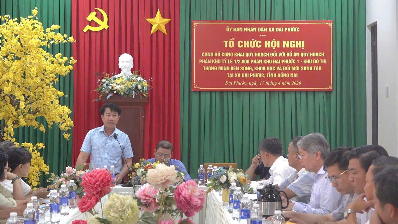 Sáng ngày 17/4/2026, UBND xã Đại Phước, tỉnh Đồng Nai đã long trọng tổ chức Hội nghị công bố quy hoạch đồ án quy hoạch phân khu tỷ lệ 1/2.000 Phân khu Đại Phước 1 – Khu đô thị thông minh ven sông, khoa học và đổi mới sáng tạo, với sự tham dự của đại diện các sở, ngành của tỉnh và lãnh đạo chính quyền địa phương, đơn vị tư vấn quy hoạch cùng đông đảo nhân dân và doanh nghiệp quan tâm tham dự hội nghị.