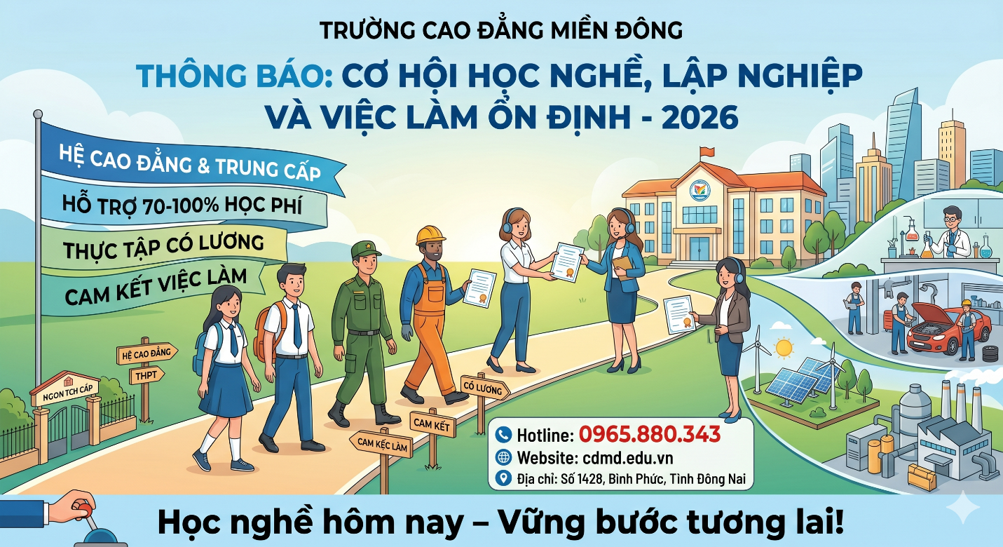 <figure class="image"><img style="aspect-ratio:624/340;" src="https://daiphuoc.dongnai.gov.vn/uploads/daiphuoc/news/2026_04/image_58.png" width="624" height="340" /></figure><p>&nbsp;</p><figure class="image"><img style="aspect-ratio:624/340;" src="https://daiphuoc.dongnai.gov.vn/uploads/daiphuoc/news/2026_04/image_57.png" width="624" height="340" /></figure><p><strong>1. Đa dạng ngành nghề – Nhận mức hỗ trợ học phí lên đến 100%</strong></p><p>Năm nay, nhà trường tuyển sinh đa dạng các lĩnh vực bám sát nhu cầu thực tế của thị trường lao động:</p><ul style="list-style-type:disc;"><li><strong>Hệ Cao đẳng (10 ngành nghề):</strong> Có cơ hội liên thông lên Đại học ngay tại trường. Đặc biệt, sinh viên theo học các ngành Công nghệ kỹ thuật hoá học, Công nghệ ô tô và Công nghệ kỹ thuật điện, điện tử sẽ được nhà nước hỗ trợ 70% học phí. Riêng ngành Công nghệ sản xuất các sản phẩm cao su được hỗ trợ 100% học phí!</li><li><strong>Hệ Trung cấp (12 ngành nghề):</strong> Có thể liên thông lên Cao đẳng ngay tại trường. Tin vui cho các em học sinh tốt nghiệp THCS là sẽ được hỗ trợ 100% học phí khi tham gia học tập. Đối với học sinh tốt nghiệp THPT, khi đăng ký các ngành như Kỹ thuật máy lạnh và điều hoà không khí, Bảo vệ thực vật, Công nghệ ô tô, Trồng trọt và bảo vệ thực vật, Điện công nghiệp và dân dụng sẽ được hỗ trợ 70% học phí. Riêng ngành Chế biến cao su hệ Trung cấp được hỗ trợ 100% học phí cho học sinh tốt nghiệp THPT.</li></ul><p><strong>2. Ai có thể đăng ký tham gia?</strong></p><p>Chương trình tuyển sinh mở rộng cánh cửa cho rất nhiều đối tượng:</p><ul style="list-style-type:disc;"><li>Các em học sinh vừa tốt nghiệp THCS hoặc THPT.</li><li>Các thanh niên, bộ đội xuất ngũ và người lao động đang có nhu cầu học một cái nghề vững chắc trong tay.</li><li>Những người đang làm việc tại các doanh nghiệp muốn nâng cao trình độ, tay nghề để thăng tiến.</li></ul><p><strong>3. Quyền lợi vượt trội khi trở thành học viên của Trường Cao đẳng Miền Đông</strong></p><p>Không chỉ được học tập trong môi trường có cơ sở vật chất, trang thiết bị đào tạo hiện đại&nbsp;cùng đội ngũ giảng viên giàu kinh nghiệm, gắn đào tạo với thực tiễn sản xuất, người học còn được hưởng loạt chính sách an sinh tuyệt vời:</p><ul style="list-style-type:disc;"><li>Được miễn, giảm học phí theo đúng quy định của Nhà nước đối với từng đối tượng.</li><li>Có cơ hội nhận học bổng khuyến khích học tập và học bổng từ các doanh nghiệp.</li><li>Được nhà trường hỗ trợ thủ tục vay vốn tín dụng ưu đãi dành cho học sinh, sinh viên.</li><li><strong>Đặc biệt nhất:</strong> Học viên sẽ được tổ chức đi thực tập tại các doanh nghiệp (có trả lương) và được nhà trường cam kết hỗ trợ giới thiệu việc làm ngay sau khi tốt nghiệp.</li></ul><p><strong>4. Cách thức đăng ký và liên hệ</strong></p><p>Toàn thể nhân dân và các bạn trẻ quan tâm xin vui lòng liên hệ ngay để không bỏ lỡ cơ hội:</p><p style="text-align:center;"><img src="https://daiphuoc.dongnai.gov.vn/uploads/daiphuoc/news/2026_04/image_56.png" width="255" height="197" /></p><ul style="list-style-type:disc;"><li><strong>Địa chỉ trường:</strong> Số 1428, Phú Riềng Đỏ, phường Bình Phước, tỉnh Đồng Nai.</li><li><strong>Đường dây nóng (Hotline):</strong> 0965.880.343.</li><li><strong>Liên hệ trực tiếp tư vấn viên:</strong> Cô Trần Thị Hồng (0931.233.880)&nbsp;hoặc Cô Trần Hương Giang (0973.193.286).</li></ul><p><strong>Tìm hiểu thêm tại:</strong> Website: cdmd.edu.vn&nbsp;hoặc Fanpage: Trường Cao đẳng Miền Đông</p>