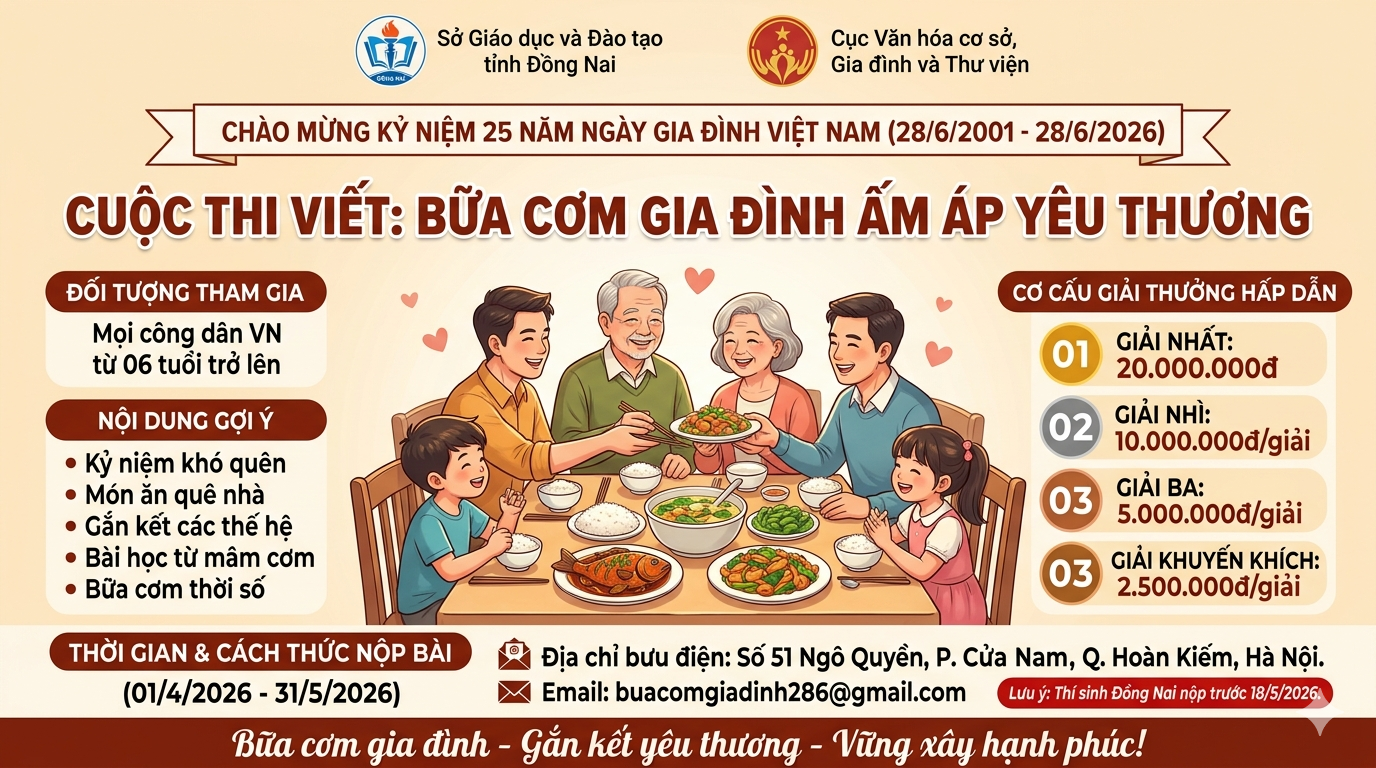 <p style="margin-left:0in;text-align:justify;"><strong>Đối tượng và nội dung tham gia</strong></p><p style="margin-left:0in;text-align:justify;">Cuộc thi dành cho mọi công dân Việt Nam đang cư trú trong và ngoài nước từ 06 tuổi trở lên. Người dự thi có thể lựa chọn viết về những kỷ niệm khó quên gắn với một bước ngoặt của gia đình, hoặc chia sẻ về những món ăn bình dị đậm đà hương vị quê nhà. Bên cạnh đó, các bài dự thi cũng có thể khai thác câu chuyện về bữa cơm giúp hóa giải mâu thuẫn, gắn kết các thế hệ; những bài học đạo đức, lòng biết ơn được giáo dục qua mâm cơm; hoặc những suy nghĩ về &quot;bữa cơm online&quot;, cách duy trì thói quen ăn cùng nhau trong thời đại chuyển đổi số bận rộn.</p><p style="margin-left:0in;text-align:justify;"><strong>Quy định về bài dự thi</strong></p><ul style="list-style-type:disc;"><li><p style="text-align:justify;"><strong>Hình thức:</strong> Bài dự thi được trình bày bằng văn xuôi tiếng Việt, có thể viết tay hoặc đánh máy trên một mặt giấy khổ A4 (đối với bản đánh máy sử dụng cỡ chữ 14, font chữ Times New Roman)</p></li><li><p style="text-align:justify;"><strong>Độ dài:</strong> Bài viết tối đa không quá 1.500 từ, bao gồm một thông điệp ngắn gọn không quá 30 từ.</p></li><li><p style="text-align:justify;"><strong>Đính kèm:</strong> Tác giả có thể gửi kèm hình ảnh (định dạng JPG, PNG) hoặc video (định dạng MP4, dài không quá 30 giây) để minh họa.</p></li><li><p style="text-align:justify;"><strong>Yêu cầu bản quyền:</strong> Bài dự thi phải là sản phẩm sáng tạo mới của chính tác giả, chưa từng vi phạm bản quyền và tuân thủ thuần phong mỹ tục Việt Nam.</p></li></ul><p style="margin-left:0in;text-align:justify;">&nbsp;</p><p style="margin-left:0in;text-align:justify;"><strong>Cơ cấu giải thưởng hấp dẫn</strong></p><p style="margin-left:0in;text-align:justify;">Cuộc thi mang đến những giải thưởng giá trị cho các tác phẩm xuất sắc:</p><ul style="list-style-type:disc;"><li><p style="text-align:justify;"><strong>01 Giải Nhất:</strong> 20.000.000 đồng.</p></li><li><p style="text-align:justify;"><strong>02 Giải Nhì:</strong> 10.000.000 đồng mỗi giải.</p></li><li><p style="text-align:justify;"><strong>03 Giải Ba:</strong> 5.000.000 đồng mỗi giải.</p></li><li><p style="text-align:justify;"><strong>03 Giải Khuyến khích:</strong> 2.500.000 đồng mỗi giải.</p></li></ul><p style="margin-left:0in;text-align:justify;"><strong>Cách thức và thời gian nộp bài</strong></p><p style="margin-left:0in;text-align:justify;">Người dự thi cần điền đầy đủ thông tin vào Phiếu đăng ký dự thi theo mẫu (đối với người dưới 18 tuổi cần có chữ ký xác nhận của cha mẹ hoặc người giám hộ).</p><ul style="list-style-type:disc;"><li><p style="text-align:justify;"><strong>Thời gian nhận bài:</strong> Từ ngày <strong>01/4/2026</strong> đến hết ngày <strong>31/5/2026</strong>.</p></li><li><p style="text-align:justify;"><strong>Địa chỉ nhận bài:</strong> * <strong>Gửi qua bưu điện:</strong> Phòng Công tác gia đình, Cục Văn hoá cơ sở, Gia đình và Thư viện - Số 51 Ngô Quyền, phường Cửa Nam, TP. Hà Nội.</p></li><li><p style="text-align:justify;"><strong>Gửi qua thư điện tử:</strong> buacomgiadinh286@gmail.com.</p></li></ul><p style="margin-left:0in;text-align:justify;"><i><strong><u>Lưu ý:</u></strong></i> Ngoài bì thư hoặc tiêu đề email cần ghi rõ: <i>“Bài viết tham gia Cuộc thi viết về Bữa cơm gia đình ấm áp yêu thương”</i>.</p><p style="margin-left:0in;text-align:justify;">Riêng đối với cán bộ, giáo viên và học sinh trên địa bàn tỉnh Đồng Nai, sau khi hoàn thiện bài dự thi đúng thể lệ, các cá nhân tổng hợp và gửi về Sở Văn hóa, Thể thao và Du lịch tỉnh Đồng Nai (qua Phòng Quản lý văn hóa) trước ngày <strong>18/5/2026</strong> để được hỗ trợ gửi về Ban tổ chức.</p><p style="margin-left:0in;">Lễ trao giải dự kiến sẽ diễn ra trong dịp kỷ niệm Ngày Gia đình Việt Nam, từ ngày 20/6 đến 28/6/2026. Chi tiết xin mời xem file “Thể lệ cuộc thi”</p><p style="margin-left:0in;text-align:right;"><strong>“Bữa cơm gia đình - Gắn kết yêu thương - Vững xây hạnh phúc!”</strong></p><p style="margin-left:0in;text-align:justify;"><img src="https://daiphuoc.dongnai.gov.vn/uploads/daiphuoc/news/2026_03/image_152.png" width="1376" height="768" /></p>