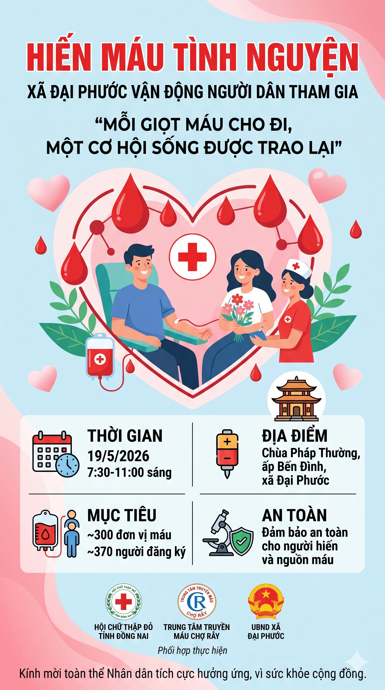 <p style="margin-left:0in;text-align:justify;">Theo đó, chương trình hiến máu tình nguyện sẽ được tổ chức vào <strong>buổi sáng ngày 19/5/2026 (thứ Ba), từ 7 giờ 30 đến 11 giờ 00</strong>, tại <strong>Chùa Pháp Thường, ấp Bến Đình, xã Đại Phước.</strong></p><p style="margin-left:0in;text-align:justify;">Đợt hiến máu lần này đặt mục tiêu tiếp nhận khoảng <strong>300 đơn vị máu</strong>, đồng thời vận động khoảng <strong>370 người tham gia đăng ký hiến máu</strong>, nhằm đảm bảo đủ số lượng sau khi thực hiện sàng lọc theo quy định. Việc kiểm tra, xét nghiệm trước khi hiến máu được thực hiện chặt chẽ nhằm đảm bảo an toàn cho người hiến và chất lượng nguồn máu tiếp nhận.</p><p style="margin-left:0in;text-align:justify;">Chương trình do Hội Chữ thập đỏ tỉnh Đồng Nai chủ trì, phối hợp với Trung tâm Truyền máu Chợ Rẫy tổ chức thực hiện. UBND xã Đại Phước, Hội Chữ thập đỏ xã và Đoàn Thanh niên xã có trách nhiệm phối hợp tuyên truyền, vận động cán bộ, công chức, viên chức, người lao động và Nhân dân tích cực tham gia.</p><p style="margin-left:0in;text-align:justify;">Hiến máu tình nguyện là nghĩa cử cao đẹp, thể hiện tinh thần “tương thân tương ái”, góp phần cứu sống người bệnh trong những tình huống cấp thiết. Mỗi giọt máu cho đi là một cơ hội sống được trao lại.</p><p style="margin-left:0in;text-align:justify;">UBND xã Đại Phước kêu gọi toàn thể Nhân dân trên địa bàn xã tích cực hưởng ứng, tham gia hiến máu tình nguyện, góp phần chung tay vì sức khỏe cộng đồng.</p><p style="margin-left:0in;text-align:center;"><img src="https://daiphuoc.dongnai.gov.vn/uploads/daiphuoc/news/2026_04/image_61.png" width="382" height="687" /></p>