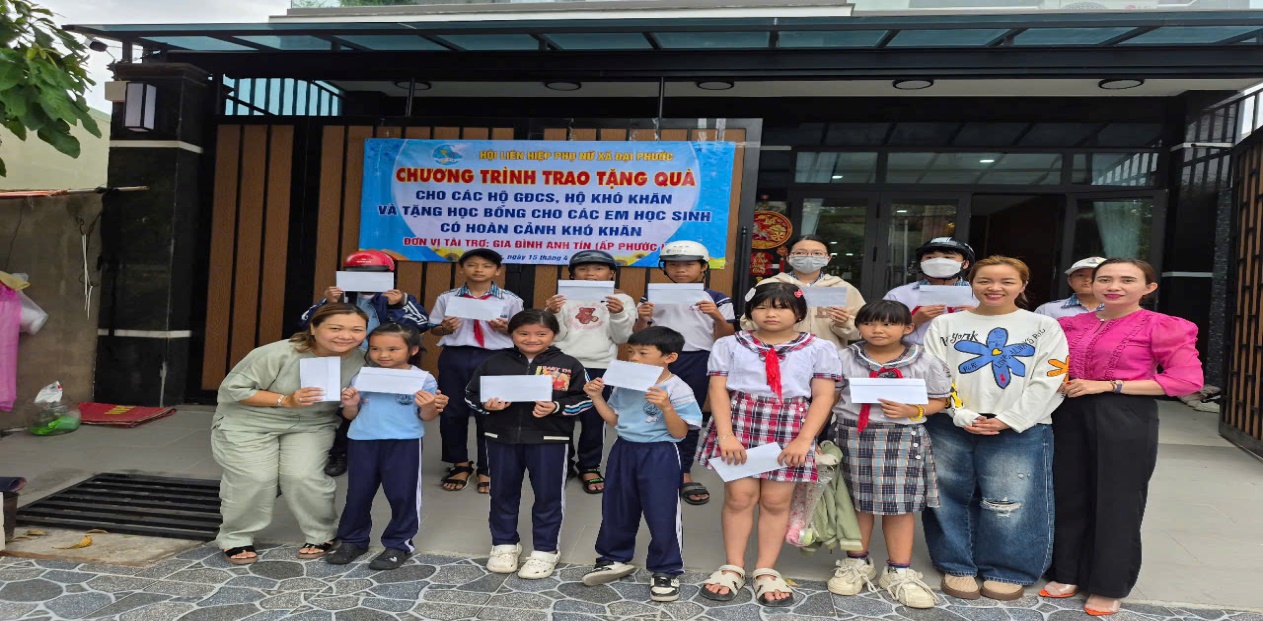 <figure class="image"><img style="aspect-ratio:624/287;" src="https://daiphuoc.dongnai.gov.vn/uploads/daiphuoc/news/2026_04/image_79.png" width="624" height="287" /></figure><p style="text-align:justify;">Tiếp tục các hoạt động chào mừng thành công Đại hội đại biểu toàn quốc lần thứ XIV của Đảng, cuộc bầu cử Đại biểu Quốc hội khóa XVI và đại biểu HĐND các cấp nhiệm kỳ 2026 – 2031, kỷ niệm 51 ngày giải phóng miền Nam thống nhất đất nước, thể hiện đạo lý “Uống nước nhớ nguồn”, “Đền ơn đáp nghĩa”.</p><figure class="image"><img style="aspect-ratio:1214/553;" src="https://daiphuoc.dongnai.gov.vn/uploads/daiphuoc/news/2026_04/image_124.jpeg" width="1214" height="553" /></figure><p style="text-align:center;"><i><strong>(Trao tặng quà gia đình chính sách)</strong></i></p><p style="text-align:justify;">Sáng ngày 15/04/2026, Hội LHPN xã Đại Phước được sự tài trợ của Hộ gia đình Anh Tín – ấp Phước Lý đã tổ chức trao tặng 100 phần quà cho các hộ gia đình chính sách, hộ khó khăn trên địa bàn xã với tổng số tiền 50 triệu đồng và 20 suất học bổng Nguyễn Thị Định cho các em học sinh vượt khó trong học tập với tổng số tiền 10.000.000đ.</p><p style="text-align:justify;"><img src="https://daiphuoc.dongnai.gov.vn/uploads/daiphuoc/news/2026_04/image_122.jpeg" width="1263" height="621" /></p><p style="text-align:center;"><i><strong>(Trao 20 suất học bổng Nguyễn Thị Định)</strong></i></p><p style="text-align:justify;">Những phần quà tuy giá trị vật chất không lớn nhưng thể hiện tấm lòng, sự quan tâm của Hội và cộng đồng chung tay chăm lo gia đình chính sách và nâng bước học sinh nghèo vượt khó, góp phần xây dựng xã hội tốt đẹp hơn.&nbsp;</p><p style="text-align:justify;">Mỗi phần quà là một tấm lòng, mỗi suất học bổng là một niềm tin gửi gắm vào tương lai.</p><p style="text-align:justify;"><img src="https://daiphuoc.dongnai.gov.vn/uploads/daiphuoc/news/2026_04/image_123.jpeg" width="1246" height="426" /></p>