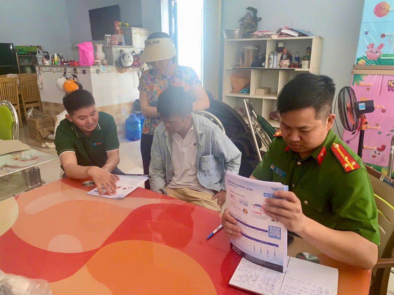Hình ảnh cán bộ Công an xã tuyên truyền, hướng dẫn các hộ dân đăng ký lắp đặt thiết bị truyền tin báo cháy