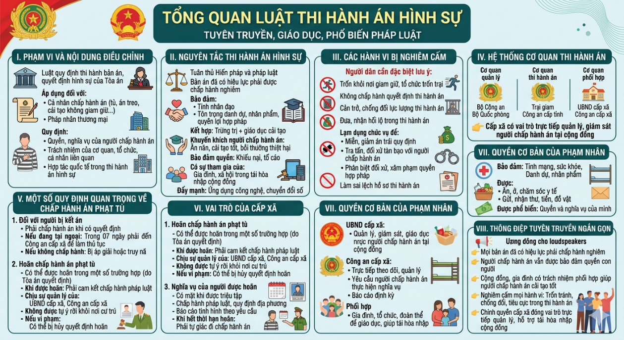 Người chấp hành án, dù trong bất kỳ hình thức nào như án phạt tù, án treo hay cải tạo không giam giữ, đều được bảo đảm các quyền cơ bản như bảo vệ tính mạng, sức khỏe, danh dự, nhân phẩm; được tạo điều kiện học tập, lao động và cải tạo để sớm tái hòa nhập cộng đồng. Việc thi hành án hình sự được thực hiện trên nguyên tắc bảo đảm tính nhân đạo, kết hợp giữa trừng trị và giáo dục, giúp người vi phạm nhận thức, sửa chữa sai lầm.