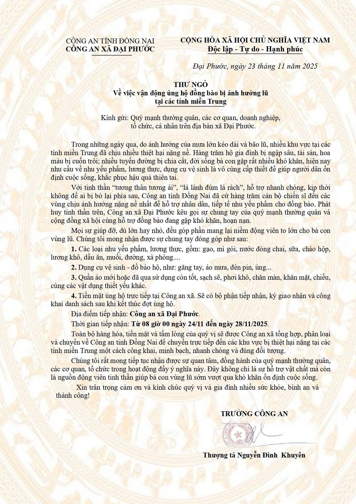 Công an xã Đại Phước trân trọng ghi nhận tấm lòng nghĩa tình của quý bà con, doanh nghiệp, mạnh thường quân và đặc biệt là những tấm gương như cô Nguyễn Thị Hoa – những người đã lan tỏa sự nhân văn và niềm tin ấm áp trong lúc đồng bào miền Trung – Tây Nguyên cần nhất.