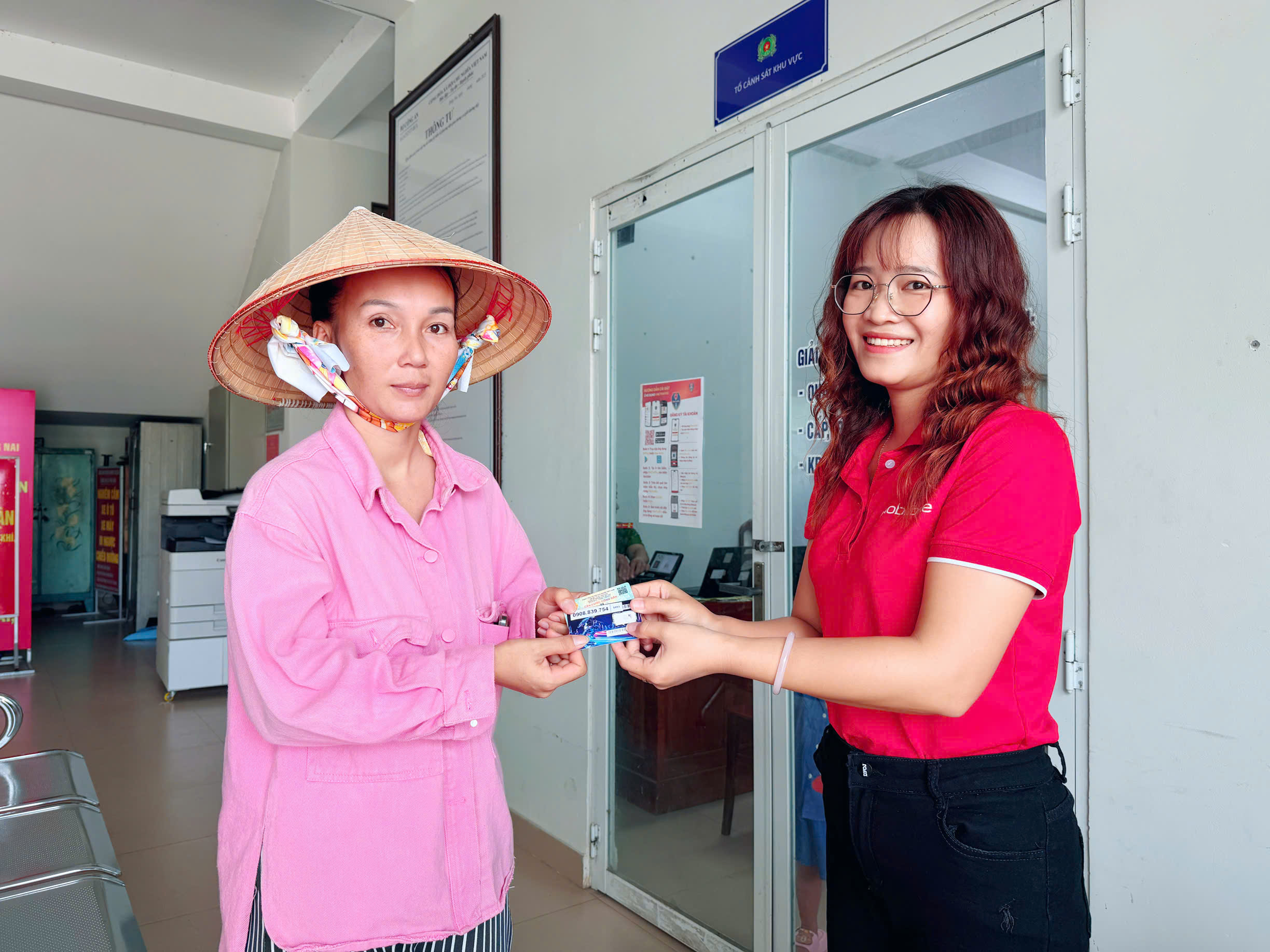 Hình ảnh nhân viên Công ty MobiFone Đồng Nai hướng dẫn, tặng sim khi người dân đăng ký kích hoạt tài khoản định danh điện tử mức độ 2
