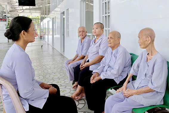 Cô Hồng ân cần trò chuyện cùng các cụ tại mái ấm.
