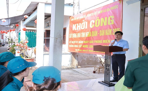 Kết thúc nội dung trao tặng quà, các đại biểu di chuyển xuống địa điểm ấp Bến Ngự để dự Lễ Khởi công xây “Nhà tình nghĩa Quân – Dân” cho hô gia đình ông Trần Vũ Hải ngụ tại Ấp Giồng Ông Đông xã Đại Phước là hộ khó khăn, nhà ở đột nát, gia đình không có điều kiện để xây dựng lại. Ngôi nhà được xây dựng với sự hỗ trợ về kinh phí nguồn Quân khu trao tặng trị giá 100.000.000 (Một trăm triệu đồng).