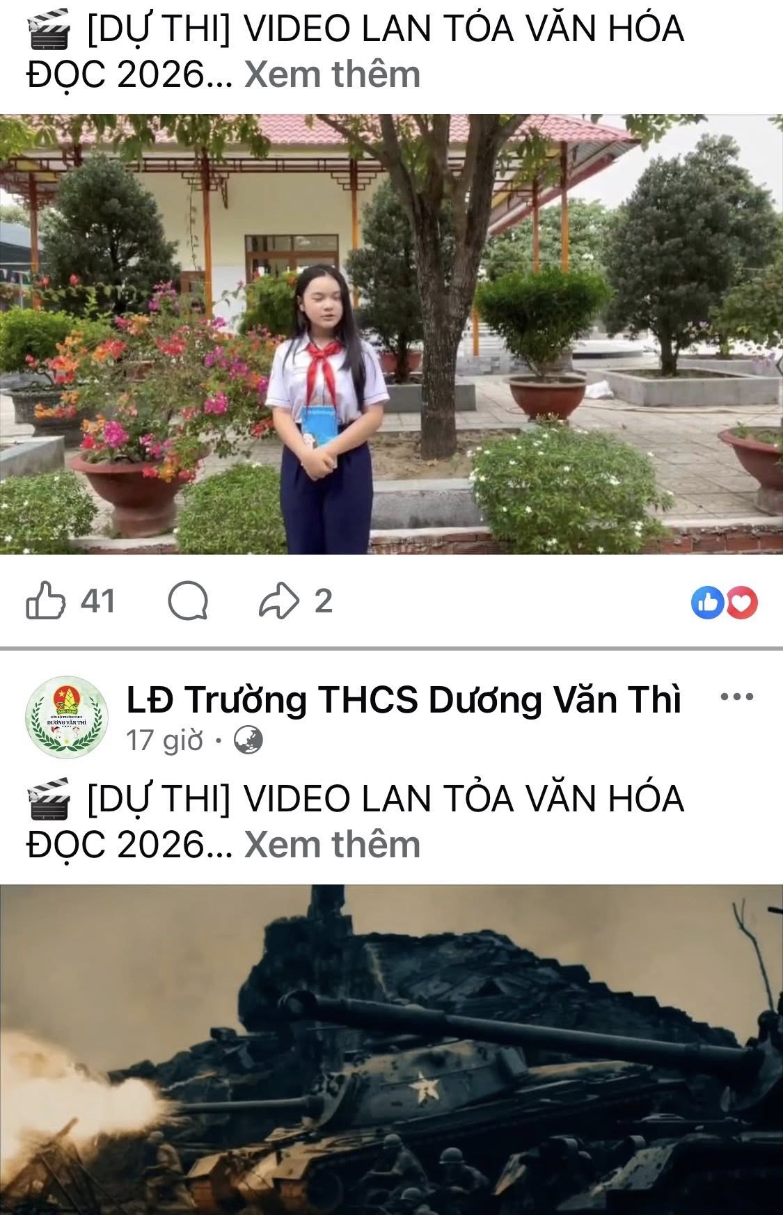 Tại Trường THCS Dương Văn Thì đã tổ chức hội thi video clip trên nền tảng facebook với chủ đề “Quyển Sách Tôi Yêu – Lan Tỏa Văn Hóa Đọc” Năm 2026 Hội thi là sân chơi bổ ích để các em học sinh giới thiệu những cuốn sách yêu thích, chia sẻ cảm nhận và lan tỏa những giá trị tốt đẹp từ sách. Qua đó, góp phần khơi dậy niềm yêu thích đọc sách, rèn luyện kỹ năng trình bày và tư duy sáng tạo.