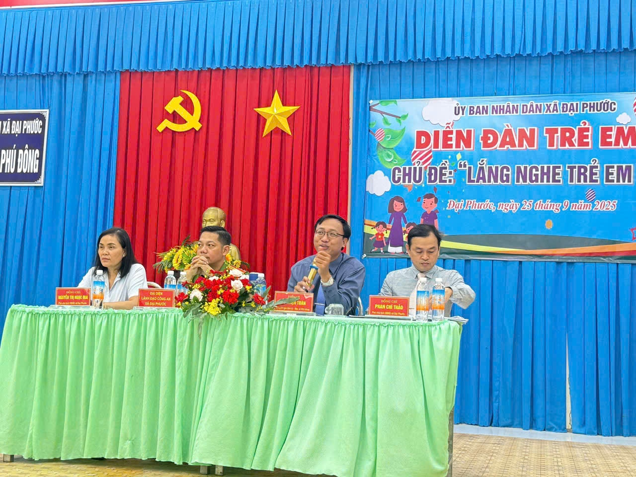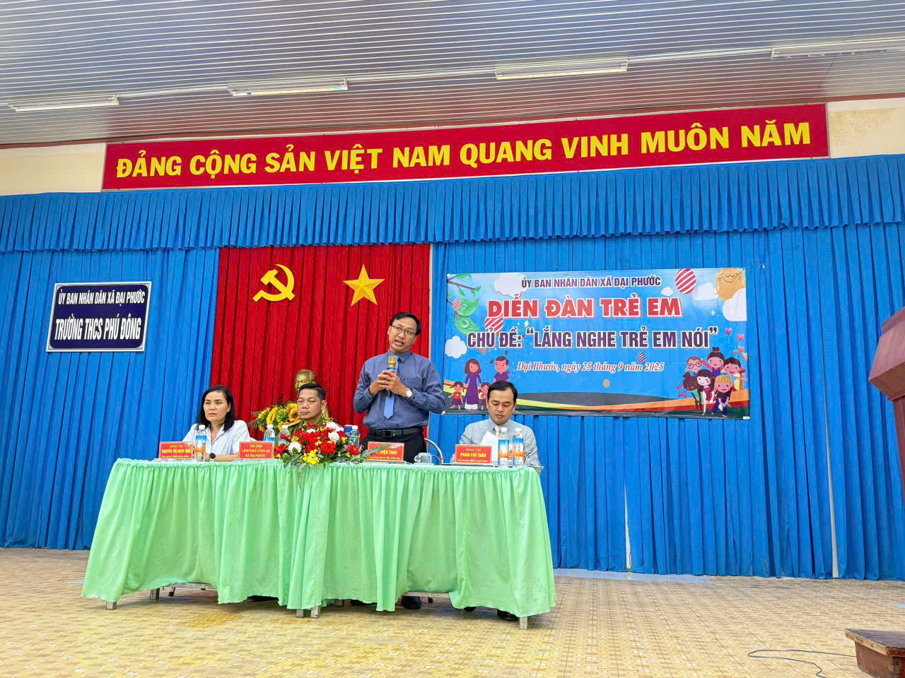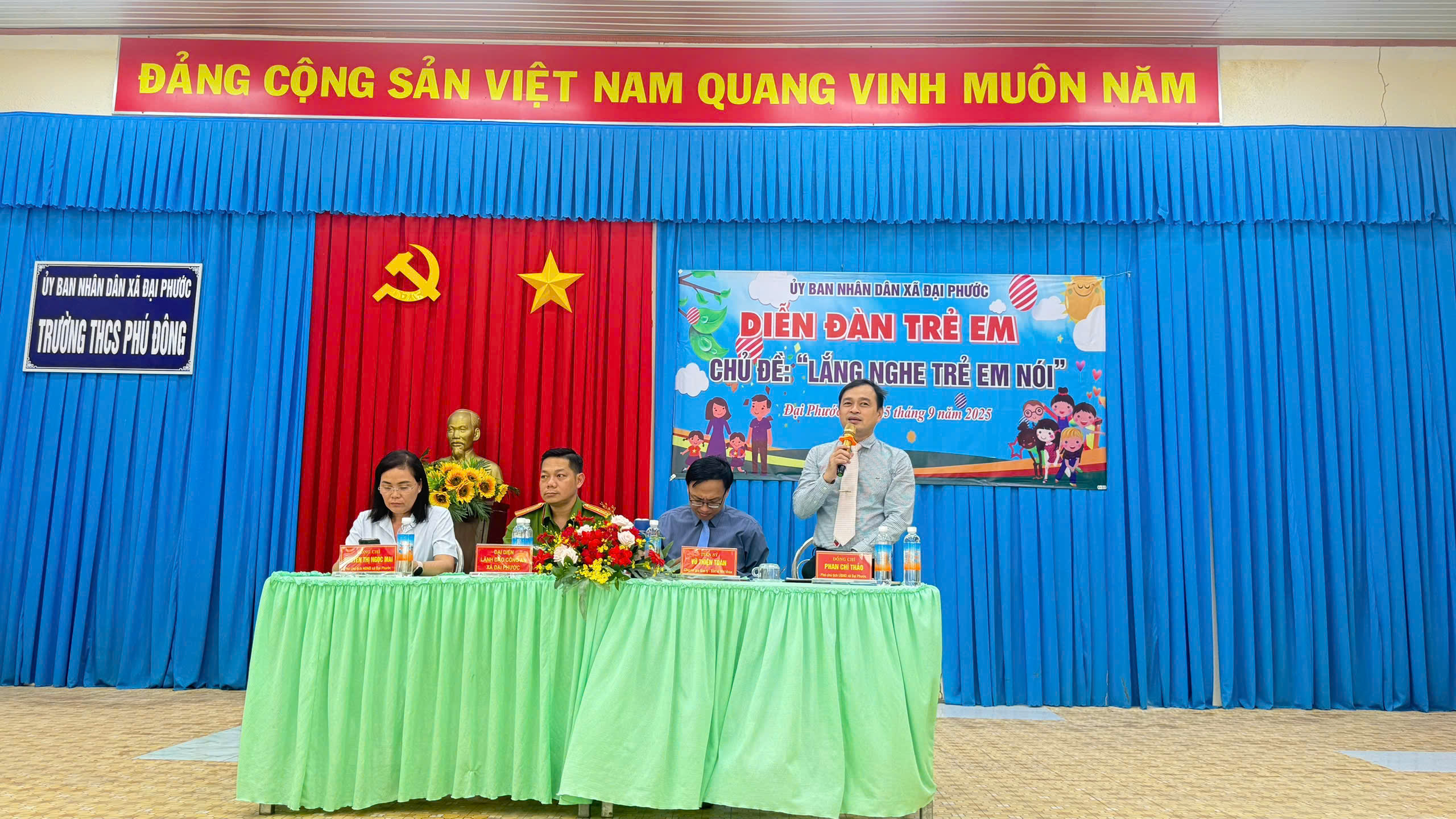 Tham dự diễn đàn cùng chia sẻ, lắng nghe ý kiến với các em có sự hiện diện của Bà Nguyễn Thị Ngọc Mai – UVBTV – Phó chủ tịch Hội đồng nhân dân xã, Ông Phan Chí Thảo – UVBTV – Phó chủ tịch Ủy ban nhân dân xã, đại diện lãnh đạo Công an Xã và Chuyên gia tâm lý Tiến sỹ Vũ Thiện Toàn đến từ Thành phố Hồ Chí Minh. Diễn đàn được diễn ra trong không khí vui tươi phấn khởi với sự góp mặt của 80 trẻ em đến từ các trường Tiểu học, THCS trên địa bàn xã Đại Phước.