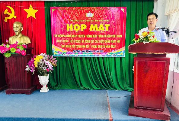 Tại buổi họp mặt, Đồng chí Châu Thành Phương đã ôn lại truyền thống 95 năm xây dựng và trưởng thành của Mặt trận Tổ quốc Việt Nam. Báo cáo đánh giá nhấn mạnh vai trò nòng cốt của hệ thống Mặt trận trong việc củng cố khối đại đoàn kết toàn dân tộc, phát huy quyền làm chủ của nhân dân và tham gia xây dựng Đảng, chính quyền vững mạnh.