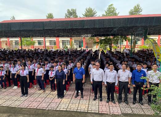 Đại biểu cùng toàn thể Thầy Cô, các em học sinh thực hiệnnghi thức Chào cờ sáng thứ 2 đầu tuần