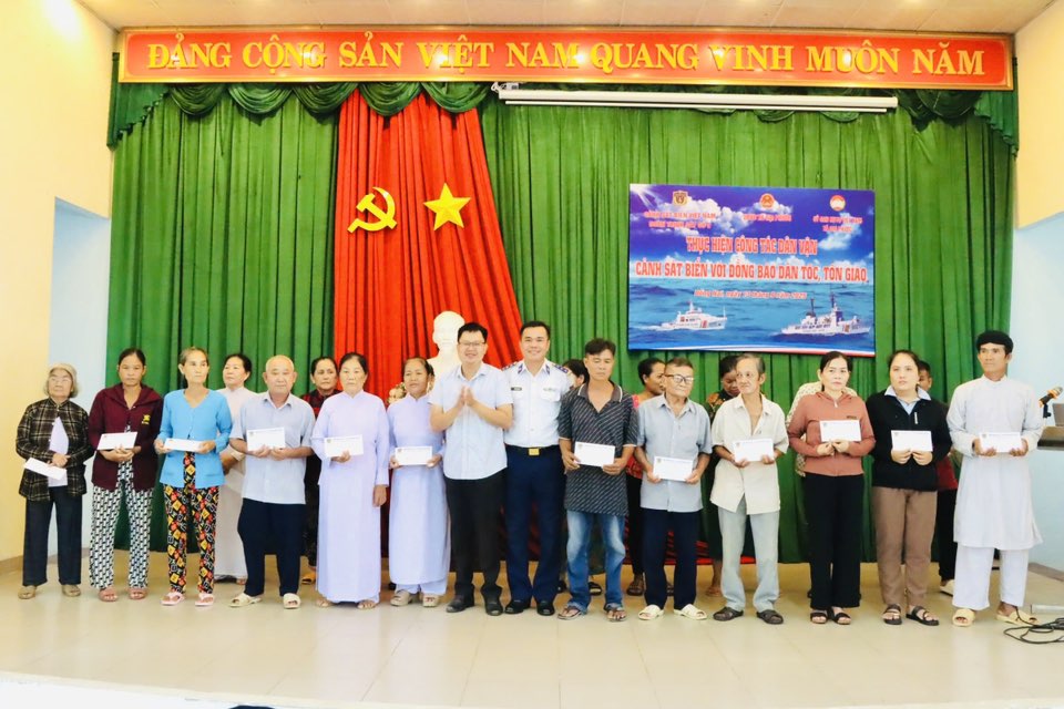 Đồng chí Châu Thành Phương – UVTV – Chủ tịch MTTQ Việt Nam xã cùng với lãnh đạo Phòng trinh sát số 2 Cảnh sát biển trao quà cho người dân